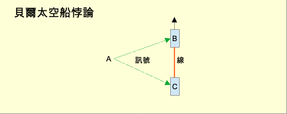 貝爾太空船悖論原先是德灣(E. Dewan)與貝然(M. Beran)在1959年提出。經過約翰·貝爾在1976年略為修改後重新敘述而以貝爾太空船悖論聞名。 根據維基百科的敘述,貝爾太空船悖論如下: 有三艘太空船A、B、C。一開始都與同一個慣性參考系相對靜止。AB之間的距離與AC之間的距離相等。B和C船頭指向同一個方向。B在前,C在後。B船尾和C船頭之間連著一條纖弱的線。B和C都存有相同關於何時加速多少的指令。然後從A送一個訊號同時抵達B和C。收到訊號後,B和C同時啟動。依照指令加速。A本身維持不動。貝爾認為:「對A來說,在任何時間B和C的速度完全相同。B和C的距離永遠保持不變。」隨著B和C加速,線會不會斷? 這個問題引起很多爭論。一般來說有三種意見: