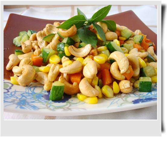 3、起鍋熱少許油,爆香薑末,先倒入胡蘿蔔丁炒至七、八成熟後,再放入玉米粒、腰果、黃瓜丁翻炒,最後用鹽、蘑菇精調味即可。