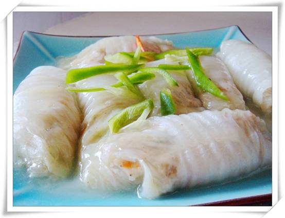 4、將做好的白菜捲連盤子一起放入蒸鍋裏蒸約30分鐘取出,把盤中的湯汁倒出,用少許粉欠勾欠後淋在菜捲上即可。