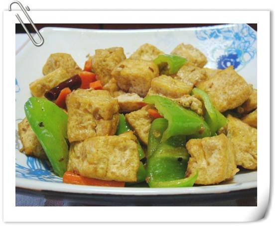 2、起鍋熱油,放入幾個幹辣椒和菜椒爆炒,再放入豆腐泡翻炒幾下後再用鹽、蘑菇精調味,即可出鍋。