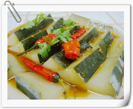 做法: 1、冬瓜切厚片,整齊地擺入盤中。野山椒洗淨後用刀在表面劃幾道口子。 2、起鍋熱少許油,爆香薑末、野山椒,並加少許水、鹽、蘑菇精、白糖調味,煮滾後將調味汁澆在冬瓜表面上,放入蒸鍋蒸5-10分鐘,取出後倒出盤中多餘的水分。 3、另起鍋熱少許油,倒入約兩大匙素蠔油,略燒後,用生粉勾簿欠,最後將蠔油欠汁淋在冬瓜上即可。 心得: 1、冬瓜不用去皮,否則蒸出來的容易爛。 2、冬瓜蒸完後,一定要控幹盤中的水分。