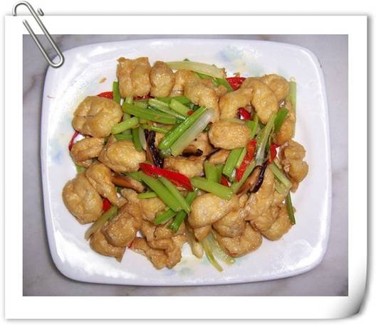 原料:油豆泡100克、芹菜100克、紅椒1個、幹香菇2朵、生薑少許。 做法: 1)芹菜洗淨、切小段;紅椒洗淨、切小段;油豆泡對切成兩半;香菇泡軟、切絲;生薑切絲; 2)用少許熱油爆香芹菜、紅椒,並盛出; 3)用熱油先炒香菇絲、薑絲,起香味後加入1小匙糖,同時放入油豆泡快速翻炒,再加生抽3小匙、清水1杯(可用泡香菇的水),燒入味; 4)加入先前爆香的芹菜、紅椒,快速拌勻,同時加入鹽,勾芡即可。