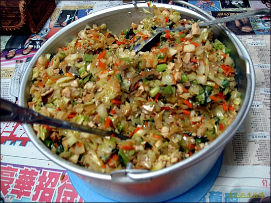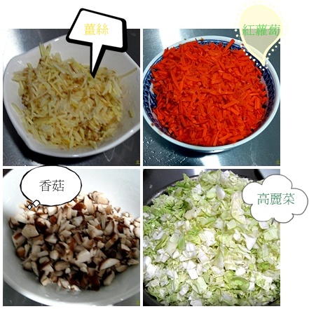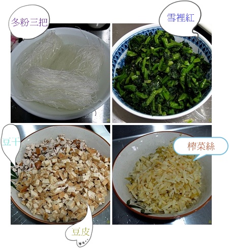 材料 冬粉 雪裡紅 豆皮 豆干 榨菜絲 薑絲 紅蘿蔔 香菇 高麗菜... 還有一個材料叫 芹菜 我忘了拍照 ...哈... 其實做水餃最麻煩的一件事就是要切菜.. 每樣菜都要切碎..因為我粗手粗腳的..所以 我的水餃料 都切的很粗.. 上面這些菜都是己經切好的了..大家有沒有看到那個高麗菜還很大一片.. 哈..沒關係拉 反正吃到肚子都嗎長的一樣...隨便拉..大家就委屈點看囉.. 現在開始要來炒菜了... 二.放入己切好的香菇 爆香 在這時 加點 香油 讓香菇的香味出來.. 三.放入薑絲 和 香菇 一起炒 四.放入已切好的 豆干 和 豆皮 抄勻 五.加入 醬油 及 胡椒粉 及 塩巴 把料炒香 六.加入紅蘿蔔 及 榨菜絲 炒勻 (這時要大火) 七.放入高麗菜 此時要在加入塩巴 然後一直攪拌 因為高麗菜在炒的過程中會出水 所以 此時要放入冬粉 還有雪裡紅 等到拌勻後 熄火 加入 芹菜 及香油 (試試看鹹度夠不夠,不夠在加入少許塩) 拌勻 (因為後半段忘了拍照..只能口述..大家將就點....) 食材:冬粉、豆干、豆皮、雪裡紅、高麗菜、榨菜、 步驟1: 冬粉泡水,再來就是切菜了,把全部的菜切成碎