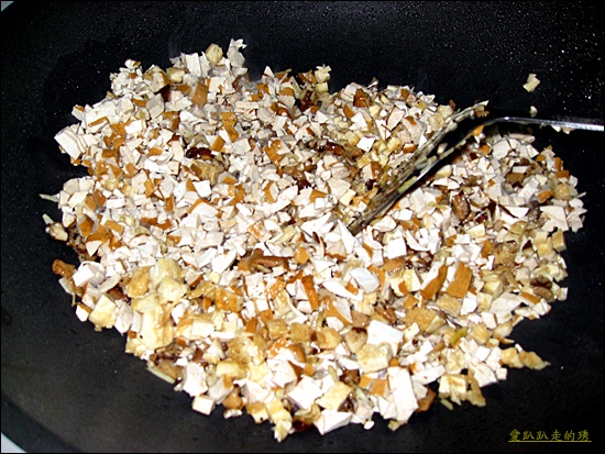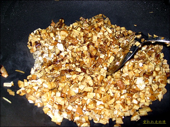 步驟4: 放入切成細碎狀的豆干和豆皮,炒勻