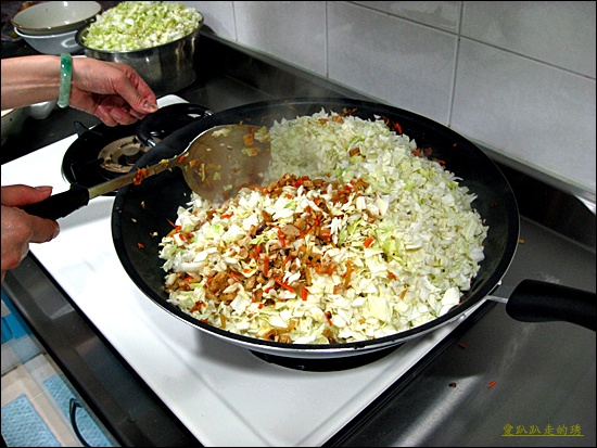 步驟7: 放入高麗菜,加鹽巴使其出水,出水後放入切得