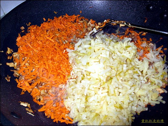 步驟6: 加入紅蘿蔔絲、榨菜絲炒勻,這時要大火
