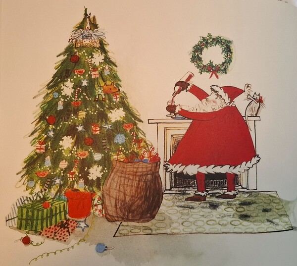 他很快地離開房間,喝了一點波特酒,吃完橘子和碎肉派,鑽出煙囪,繼續趕路。
