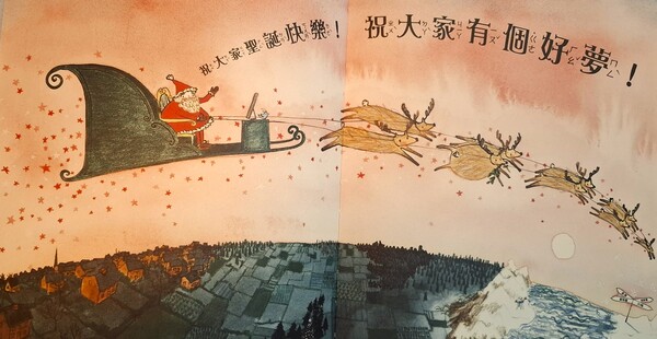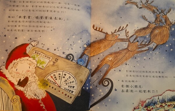 於是,胖嘟嘟又累壞了的聖誕老公公又飛回夏夏和小山的家,再度躡手躡腳地走進雙胞胎的房間,當他看見兩隻半滿的聖誕襪就笑了,於是立刻超迅速地將兩隻聖誕襪都裝滿禮物,再趕緊離開。在準備鑽進煙囪時,腦海裡閃過個念頭,聖誕老公公再趕緊上樓,把一個小東西放進夏夏的聖誕襪裡,接著超開心地駕著雪橇飛走,同時高喊:祝大家聖誕快樂!
