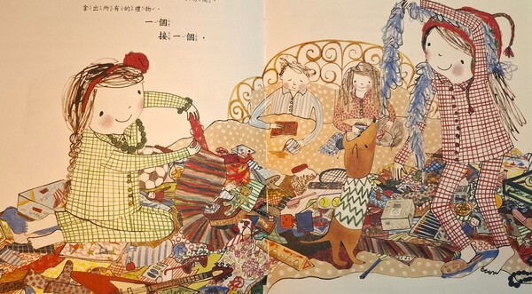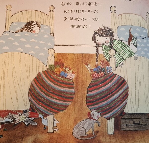 夏夏開始安靜地做一件事,絕對不能吵醒小山,她將禮物從塞得滿滿的聖誕襪裡一件件拿出來,就像在算數學一樣,平分成兩份,即使是她很喜歡的禮物,也還是平分成兩份,然後將禮物平均裝進小山和夏夏的聖誕襪裡,半滿的聖誕襪總比空空的聖誕襪好多了!當順利完成了以後,夏夏鬆了一口氣,回床上繼續睡覺。