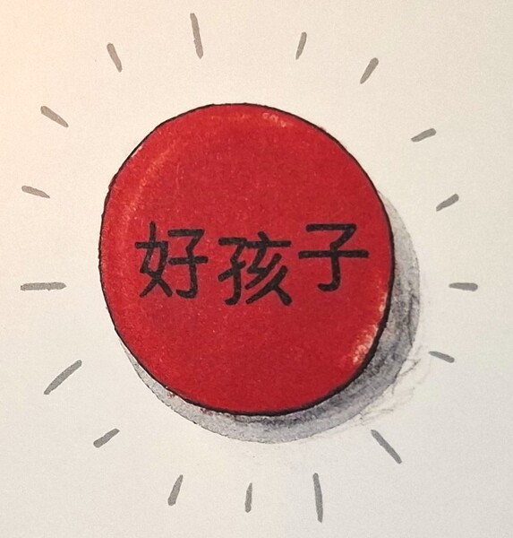 她知道自己有時候真的很頑皮,可是她覺得徽章上的字一點也沒錯… (你知道是什麼字嗎?) 徽章上印了三個字… 好孩子!