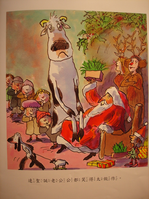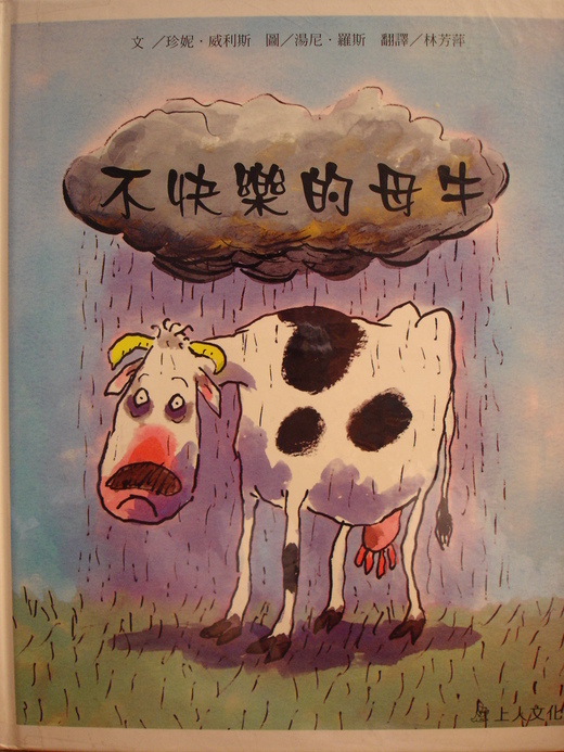 10:07-10:20(11:07-11:20) 說故事「不快樂的母牛」 有一隻不快樂的母牛,叫做哞吽(母牛怎麼叫?)。她總是看什麼都不順眼。有一天,下雨天,哞哞很不開心,小綿羊咩咩(小綿羊怎麼叫?老綿羊呢?感冒的小綿羊呢?)來關心哞哞,告訴哞哞下雨有就好吃的青草可以吃,於是哞哞在雨中吃起青草大餐。可是,下一次咩咩看見哞哞,她快樂嗎?不快樂!那一天是哞哞生日,哞哞認為生日過完又老一歲,於是咩咩拉著哞哞來開生日舞會。可是,下一次看到哞哞,還是…不快樂。「你怎麼了嘛?」「風景永遠都一樣。」咩咩教哞哞倒立看風景,咦,真的很有趣耶!可是,下一次見到的哞哞還是不快樂,因為「冬天到了」,咩咩:「那表示聖誕節也到了,聖誕快樂!」他們一起共度聖誕節,但哞哞看什麼都不快樂:「聖誕燈太亮,煙火太吵,連聖誕老公公都笑得好假!」終於,咩咩傷心地離開哞哞了,因為哞哞,她也開始覺得世界真無聊,也不忍心再看哞哞那麼不快樂。哞哞沒有咩咩陪伴,開始想念她,到處找她(你有沒有看到哞哞?),沒想到在爛泥巴裡找到咩咩,知道咩咩是因為把她當作最好的朋友才會為她傷心難過!哞哞好高興啊,於是送給咩咩一個最大最棒的笑容,讓咩咩也快樂起來,從此互相陪伴,就算下雨天也很開心了!