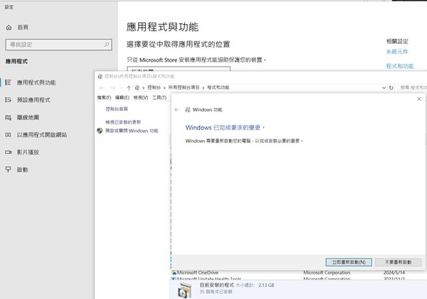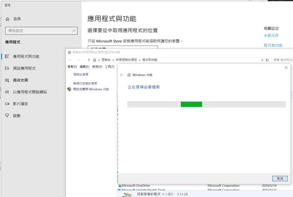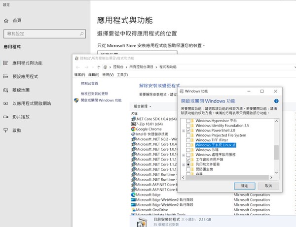 勾選Windows 子系統Linux版,並且按下確定後,系統會開始進行安裝。