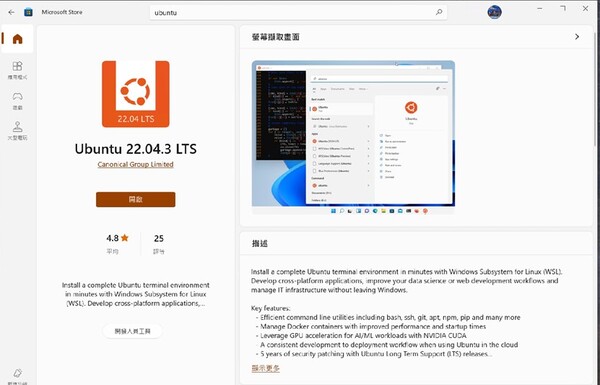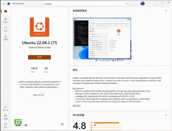 在Store中,搜尋Ubuntu,找到最新版本的Ubuntu APP版本。