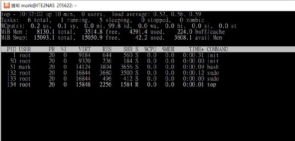 接下來我們試試看幾個常用的Ubuntu指令。 Sudo top 檢視系統資源狀態。