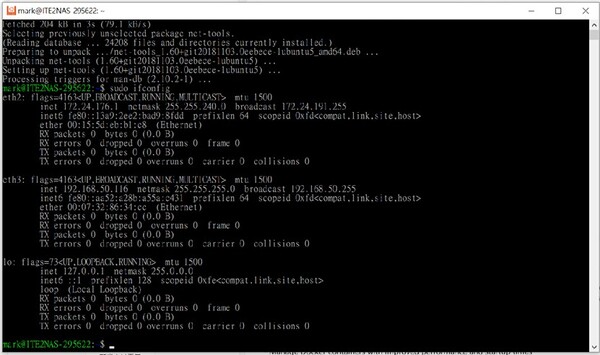 接下來,我們繼續測試幾個常用的Linux指令,例如檢視網路設定的ifconfig,但是發現無法執行。這是Ubuntu APP尚未安裝網路套件,接下來我們再繼續安裝網路套件。