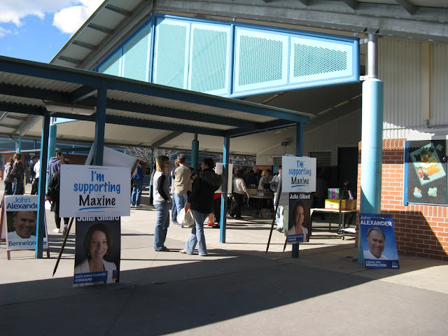 2010.08.21 今天有點風,冬末春初,湛藍的天空、溫暖的陽光,是投票的好日子。不過,在澳洲,不管天氣如何,投票日每個公民都得去投票所投票,除非是已經在投票日之前就先投了。因為在澳洲,中央及地方選舉都是強制性投票。 經過鄰居家,聯邦創建時期﹝1901年﹞的建築,少說也有一百年的歷史,不過這種老建築的身價卻比新建築高,特點是雙層磚牆、挑高的雕花天花板、手工彩色玻璃窗,是內行買家口中的Art Deco或Federation Style建築,炙手可熱,因為奇貨可居。 往投票所的路上,路旁隨處可見尤加利樹,澳洲的樹林幾乎都是尤加利樹,俗稱Gum Tree。距我家最近的投票所就設在兒子唸的小學的大禮堂裡。就是上禮拜六兒子學校開Disco Party募款的地方啦! 一到了投票所,映入眼裡的就是我之前在「選舉造勢」一文中所說的像房地產經紀商的候選人廣告。畫面上沒拍到的是入口處的助選員穿著各黨的小背心在發 How to Vote Card。 到投票所時,約下午1:30。哇!隊伍已排這麼長囉!還以為中午時間人潮會比較少。 把手上剛拿到的各黨給的 How to Vote Card,先研究研究吧!雖然我心裡已經決定投誰了。 How to Vote Card 就是各黨教支持者如何在選票上將候選人或黨排順序,才會將票投給該黨或該黨的候選人。澳洲的選舉制是絕對多數票才能當選,選票的圈選是要在選票上將候選人依偏好順序從1、2、3、、、一直排到最後或將黨團排順序。 一般How to Vote Card 後面都會有至少八種語言文字的投票解說;選務機關通常也必須印製近三十種語言文字的選舉說明信件。這張綠黨的How to Vote Card 還附帶簡易解說了偏好排序的選舉方式是如何計票的。澳洲是多元文化的移民國家,有許多新移民在其原屬國家可能沒有民主選舉、也可能從來沒有投過票,所以選務機關的宣導很重要。 研究完畢,排隊去也! 終於排到投票所的入口了,咻! 投票所的最遠方,看起來沒有選民,只有一工作人員的一角,是Absent Voting 的投票處。Absent Voting 就是類似台灣在研究的選舉日的不在籍投票,是方便選舉日正好外出不能在自己的選區投票的人設立的投票所,可以接受全國任何一選區的選民來投票。 這裡是本選區的取票區。只要告訴工作人員你的名字,工作人員就會在選民名冊上找你名字,找到名字後,再問你的地址,與名冊上的地址核對無誤之後,就會問:「你今天投過票了嗎?」你如果答:「沒有」,工作人員就會在選票右上角簽名後發給你。選民完全不必帶任何身份證件﹝澳洲沒有身份證﹞或駕駛執照、、、等等,只要把人帶去就好。 領了選票,就到對面圈票的桌子上畫選票。桌子上附有一隻鉛筆,但是沒有橡皮擦;如果不小心排錯順序了,只要將選票拿去給發票的工作人員,就可以換一張新選票,重新排順序。選民也可以將剛剛拿到的自己支持的黨的 How to Vote Card 拿到選票桌上,按照該黨的指示在選票上排列順序。 我這次選舉特別研究了一下各政黨及候選人,所以我不但將本選區下議院的候選人從1排到11,並且把上議院的32個黨團從1排到32。我確定我不是最瘋狂的選民,一定有其他選民將上議院的候選人從1排到349。哈哈!我不但要表達「民意」,還要順便測試一下聯邦選務機關的計票系統會不會當機! 正當我在排順序時,一位操大陸口音的老先生湊過來我這小小的選票桌,問道:「小姐,妳會說中文嗎?」 我說:「會啊!有需要我幫忙嗎?」 老先生說:「小姐,妳幫我看一下我畫得對不對,我要選工黨。」 我將手上的鉛筆放下,拿起老先生的綠色選票﹝下議院﹞及白色的大張選票﹝上議院﹞幫他看了一下他有沒有畫錯黨。 老先生在旁邊拿著工黨的How to Vote Card,一邊又對照自己畫的選票。 我跟老先生說:「沒錯,你選的就是工黨!」 老先生很高興沒選錯,就問起我來:「小姐,那你選哪一黨啊?」 我心想:這位大陸來的老先生生,年齡絕對超過七十歲,大概是生平第一次投票吧! 被老先生一問,我有點不好意思說沒有人這樣問的啦!況且,我還在圈選票圈到一半呢! 只好趕快轉移話題:「好,你可以把你的兩張選票投到投票箱裡去了。」 老先生開始不安,站在我旁邊,一會兒後,又問我:「選票要怎麼折成小張才能投入選票箱啊?」 我先是一愣,接著說:「隨便折啊,能投入就好,不然,拿給票箱旁邊的工作人員也可以。」 老先生:「怕把票弄壞了。」 我:「沒關係的,票圈錯或是弄壞了,拿給工作人員,再換一張就好,不要緊的。」 老先生道謝後,便向投票箱走去。 我也繼續在選票上排順序、、、 ㄟ,剛剛排到幾號了啊? 投票所的出口放著兩只瓦楞紙折成的投票箱:一只是投上議院選票,一只是投下議院選票。 投完票,在投票所外逛一逛,照例的投票所所在的兒子唸的小學家長會,一定不會放過選舉日這人潮洶湧的日子為學校募款,賣學校媽媽們自製的蛋糕,還有大家捐贈的舊書和舊CD。蛋糕、CD和書都是一件一塊錢。 名符其實的「一元店」義賣。 本區的扶輪社也來義賣,吐司夾現烤香腸sausage sizzle和茶、咖啡,正好方便了趕來投票而來不及吃午餐的選民。 投票的隊伍排得更長了! 選民見習生。十幾年後 Ms & Mr Smith姐弟就得加入投票的隊伍啦! ○○●●●○○ 上一次﹝2007年﹞聯邦大選總共花費:六百三十萬澳幣﹝A$ 6.3 million﹞。 這次﹝2010年﹞聯邦大選: