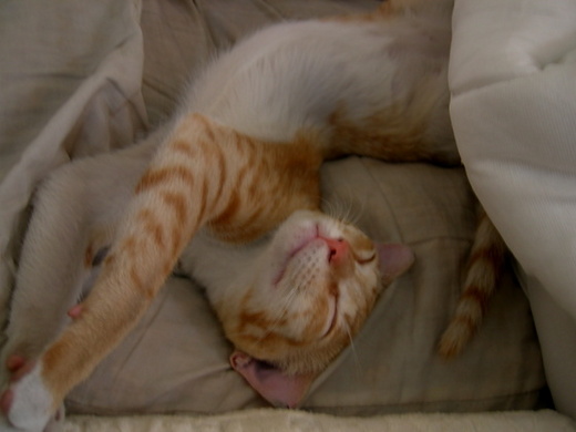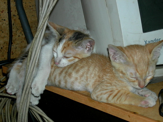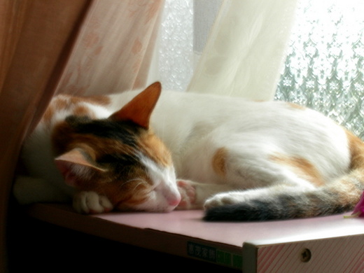 我家的喵已經滿一歲了~~ 這一年來~我天天為它牽腸掛肚的~8月份黃喵一次車禍讓我取消了暑期旅遊行程 因為我實在放不下這兩隻可愛的喵呀! 去年的11月16日我在花園的水溝撈起黃喵~見白喵在水溝旁一直為掉下水的黃喵喵喵叫 真是於心不忍~那麼冷的天~黃喵渾身濕搭搭的~抓去水龍頭簡單的沖洗~拿起小孩不穿 的衣服將他們包起帶回家~沒有想太多~假如老公沒拒絕就這樣養牠~於是他們就在我家 定居下來了~我好愛牠們~因為小孩長大了~不用我煩惱~現在喵跟花就是我的生活重心!
