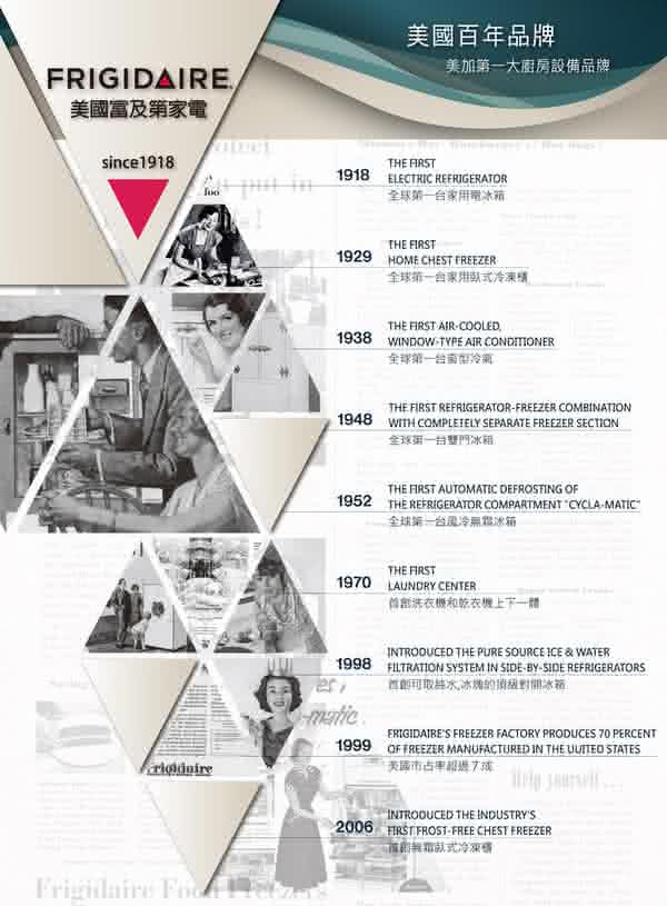 品牌介紹: 【美國Frigidaire家電】成立於1918年, 隸屬於全球第二大家電廠集團旗下第一大美國品牌, 全美已有超過2000萬家庭使用Frigidaire商品, 自2011年開始全系列商品原裝進口自集團協力工廠,同步於世界各地! 是目前美國暨加拿大第一大廚房設備品牌,廚房設備在北美市占率約2成! 也是全球第一台電冰箱,雙門冰箱,無霜冰箱製造商,冰箱在北美市占率約2成5! 更是全球第一台臥式冷凍櫃,無霜臥式冷凍櫃製造商,冷凍櫃在北美市占率約3成!
