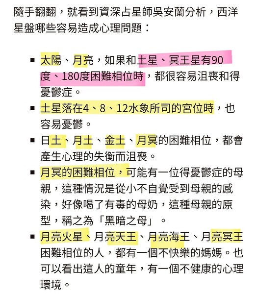 看完董襲瑩 肖飛之子的星盤,真的要講,【找孩子的爸,太重要了,不要亂找】【懷孕的時候要開心,否則影響小孩】 我前幾篇文章還提到董襲瑩雖然家財萬貫+父母安排,看似好命,其實董襲瑩一點都不快樂,從這個小孩的命盤完全印證。 小孩情緒起伏大,很難帶,這是結論。 這小孩是要讓董襲瑩.肖飛【學會愛.學會付出】這件事。 1.月亮落12宮,情緒問題。 2.月亮.金星180度沖,藍色線,感情挑剔,和A在一起就覺得B好,和C在一起就想B的好,這根本和肖飛一樣。如果無法克服內心的空洞,就是花心男。 3.月亮.土星180度沖,藍色線,情緒焦慮。 4.月亮.冥王120度,這個比90.180度好一點,但是月冥人的極限拉扯.控制,都是一個調性,就算月冥人在情感的高位,吸引的也都是有個性問題的,我就有幾位月冥120度的女性,她們在情場的確受歡迎,但是都是換來換去,很難穩定下來,看似很多桃花,但是沒能長久。 還有,孩子是月冥人,媽媽董襲瑩是月冥人的機率非常非常高。 5.火星.冥王180度,這個比較嚴重,火冥90.180,很容易出現冷血.暴力的人。 結論:這小孩非常不好帶,小孩有情緒問題,要非常非常非常有耐心,小孩的水星在牡羊8宮,很聰明,木星在9宮,小孩聰明會念書,腦袋聰明+情緒問題+性格暴力.冷血,長大是災難。這孩子金火120,很有桃花。 想像一下,這孩子聰明又有桃花,一堆傻女孩圍繞著轉,這不就是小肖飛一枚!這種遺傳真的很可怕! 所以我才會講,這個孩子,是要讓肖飛.董襲瑩學會愛的孩子。