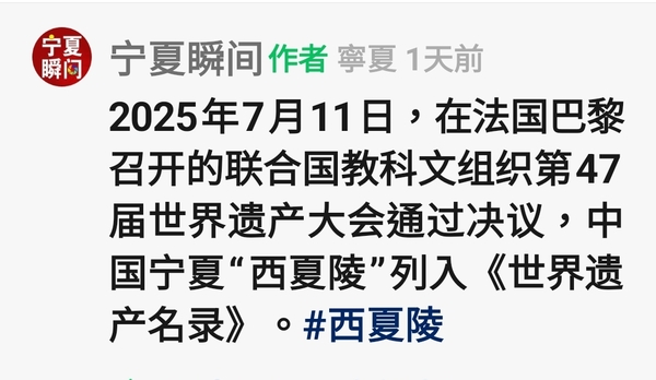 「西夏陵」入列世遺名錄 中國總數增至60 保持世界前列 | 大陸傳真 | 兩岸 | 聯合新聞網 https://share.google/1KMBRluS4B5dzQ2X9 正在法國巴黎召開的聯合國教科文組織第47屆世界遺產大會11日晚通過決議,將中國申報的「西夏陵」列入「世界遺產名錄」。至此,中國的世界遺產總數達到60項,保持了世界前列的位序。 西夏王朝於公元1038年建國,1227年被蒙古大軍攻陷,此後便消失在歷史長河中,前後僅存續190年。 央視新聞報導,此次申遺的西夏陵共包含四大人工建造的遺存要素,分別是9座西夏帝陵、271座陪葬墓以及32處防洪遺跡,還有一處面積達5萬餘平方米的建築基址,考古初步判斷是與祭祀相關的大型場所。 此外,西夏陵遺址博物館還存有7000餘件可移動文物。整個遺址區面積達38.99平方公里,是現存規模最大、等級最高、保存最完整的西夏文化遺存。可直接為中國歷史上黨項族創立並延續近200年的西夏王朝及其君主世系,提供不可替代的特殊見證,實證公元11至13世紀,西夏在「絲綢之路」上的中繼樞紐地位。 中國建築設計研究院建築歷史研究所名譽所長陳同濱表示,西夏陵遺址整個構成要素一部分是自然要素、一部分是人工要素,共同合成了西夏陵的獨特景觀。這次申遺是對西夏的重新認識,因為西夏在中國的二十四史上沒有記載,但它是與宋、遼、金同時存在的王朝。 報導稱,20世紀30年代,德國漢莎航空公司飛行員卡斯特爾飛越寧夏賀蘭山時,用隨身攜帶的相機「定格」下山腳下一片神祕建築—圓錐形的「土堆」。此後,西夏陵再次進入公眾的視野是在1972年至1977年間,考古人員第一次對西夏陵進行系統調查和科學發掘,證實了「嘉靖寧夏新志」所記載的西夏陵處於賀蘭山之東,西夏陵的存在由此確認。 |