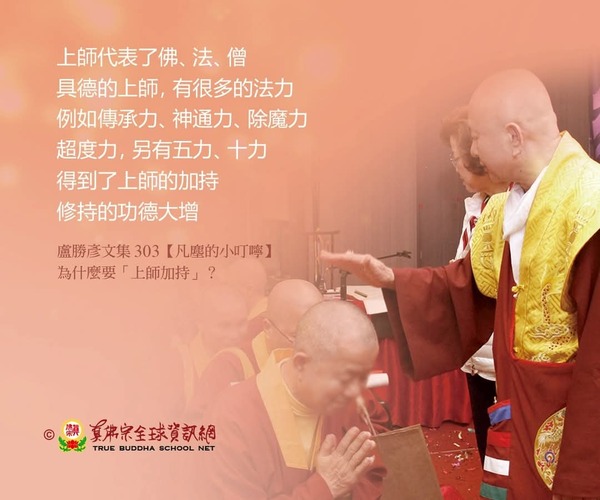 「因為上師代表了佛、法、僧。具德的上師,有很多的法力,例如傳承力、神通力、除魔力、超度力,另有五力、十力。得到了上師的加持,修持的功德大增。」
