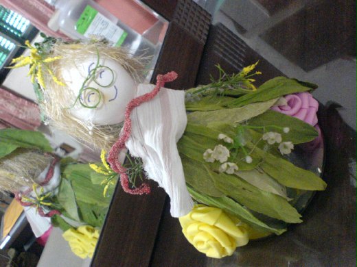 看著每次吃完的蛋殼都要丟掉 看著每次保特瓶喝完就要丟掉 看著每次鄰居大掃除有假花要丟掉 看著每次附近地上的被丟的光碟片 看著一堆垃圾~或者是人家不要的東西 丟掉真的是好可惜 我把一些假花~保特瓶~蛋殼~雞的毛(雞毛襢子上的雞毛)~ 還有有人躺的草枕頭~裡面裝雜早的那種 我就分別製得了三樣環保人偶 雞毛當頭髮~保特瓶當身體~蛋殼當頭~假花把花和葉取下來 分別貼在保特瓶上當作裝飾 把不要的光碟用熱熔膠黏在底部固定讓它可以站立 不要用的東西~在我的巧思下~變成了完美的環保作品 看起來不起眼的東西~在我的巧手下~也會變成很亮眼的東西 這三樣~分別送給了我在高中裡最喜歡的老師 另一個當作生日禮物送給了同學 他們都很高興..我有和他們解釋那些東西製作的經過 他們不但不嫌棄~反而還很高興~~ |