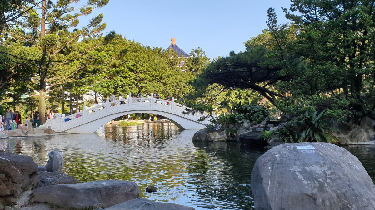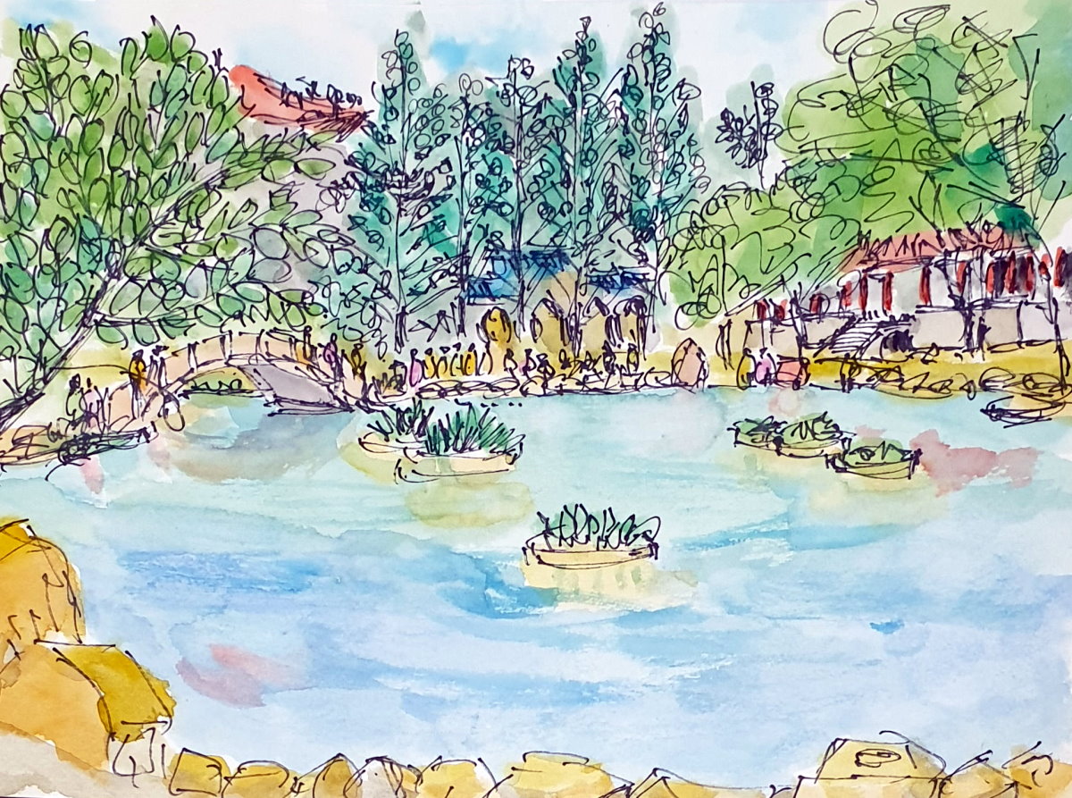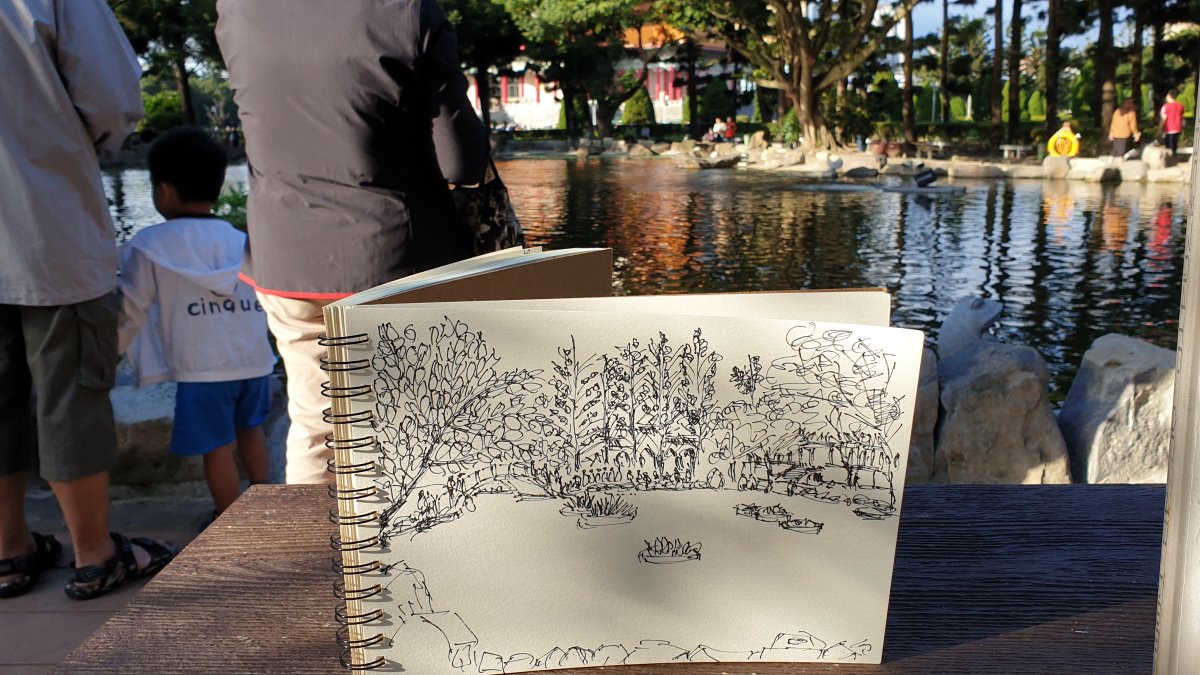 為甚麼到這裡總會畫上幾張,是因為水塘造視野上的延伸,讓畫面有景深,橋與浮島就宛若靜物裏的香蕉與橘子,可以自然安放。