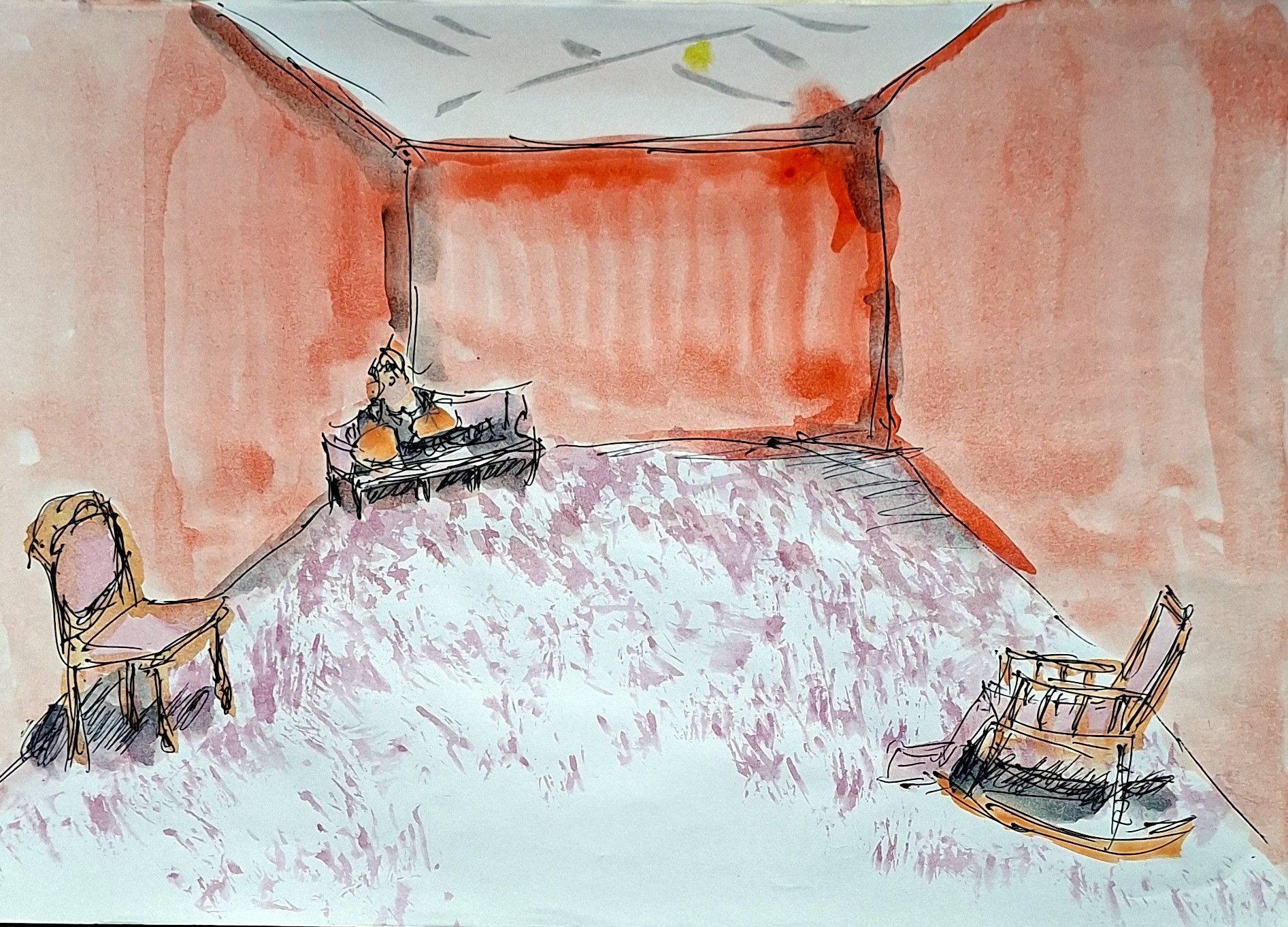 這張圖,其實畫了一陣子了。因為當時沒好好記錄,一直不敢隨便貼出來。但這次的展覽卻讓我印象特別深刻。 整個空間裡只有三件作品,擺放得極其克制,彼此保持距離,幾乎只剩下「善讓」與留白。什麼都沒有,卻又什麼都在。上方的探照燈投射出強烈光線,把原本單一的紅色牆面打出層次,整個空間因此變得有些不同。牆色不再只是背景,而是作品的一部分,像是情緒的擴音器,無聲地說話。 有時我也會疑問:「這樣就算展覽嗎?」三件作品,就佔據了整個美術館。但在那片空無中,我反而靜靜地站了一會兒,覺得很平靜、很舒服。好像真的有跟創作者對話了一下,雖然什麼也沒說。 也許就是因為這樣,我才默默地把它劃了下來。 |