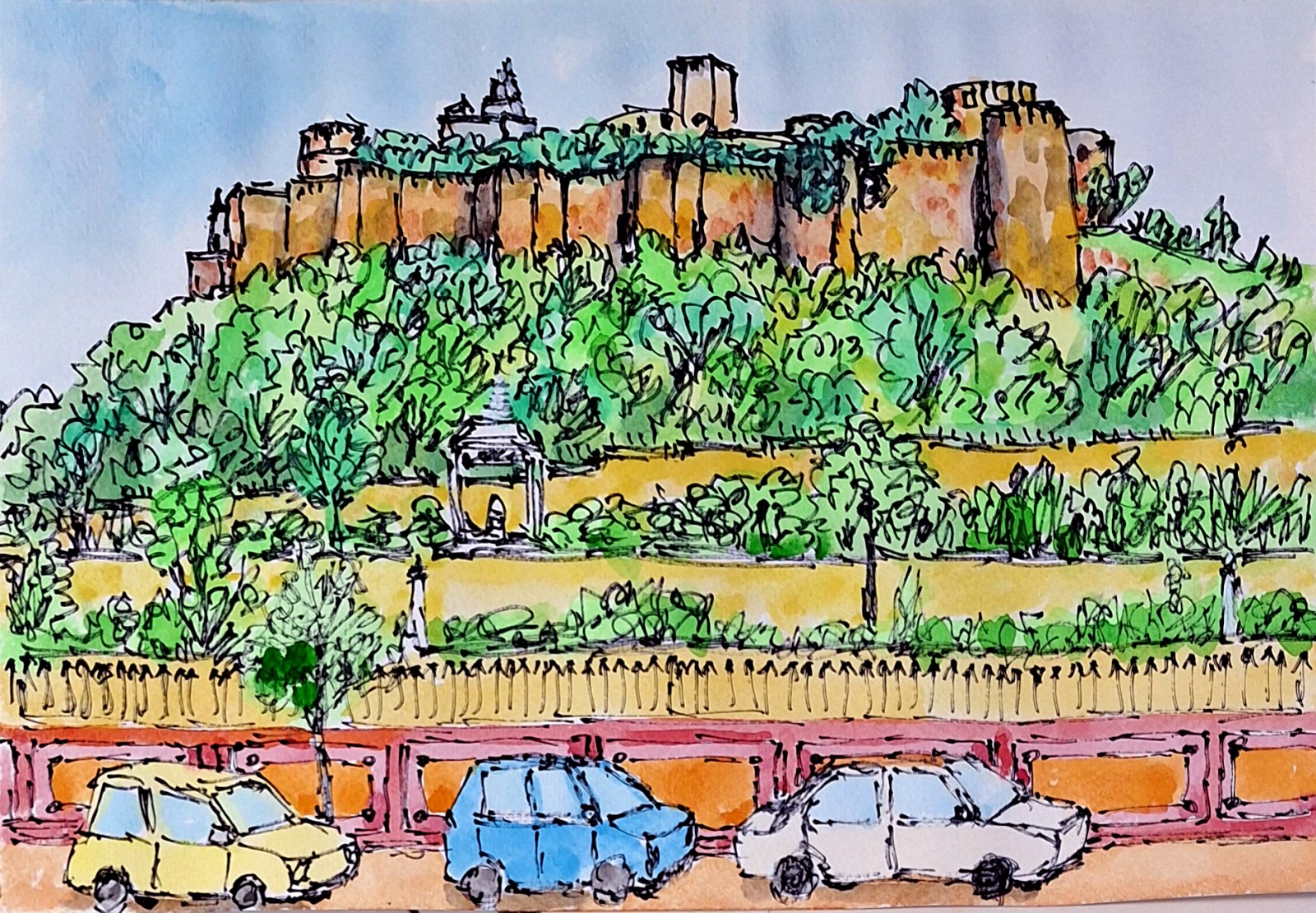 這是一張印度齋浦爾莫蒂杜格里堡的街頭速寫,運用水彩和鋼筆,以細膩的筆觸和鮮明的色彩,生動地描繪了這座古老建築的風采。 莫蒂杜格里堡位於畫面中上方,以其獨特的建築風格和色彩,成為視覺焦點。三輛色彩鮮豔的汽車,黃色、藍色和白色,由左至右排列,增添了畫面的生機和動感。綠樹成蔭,環繞著莫蒂杜格里堡,豐富了畫面的層次,也襯托出堡壘的歷史感。顏色暈染的天空,與莫蒂杜格里堡相互呼應,營造出和諧的氛圍。 色彩運用豐富而協調,莫蒂杜格里堡的土黃色、綠樹的翠綠、天空的淡藍,都恰到好處地表現了景物的質感和光影效果。勾勒出建築的細節和輪廓,線條流暢而有力,使畫面更具表現力。整幅畫作一氣呵成,筆觸自然,生動地捕捉了街頭的瞬間,充滿了生活氣息。 異國情調:莫蒂杜格里堡是齋浦爾的著名地標,具有濃郁的印度文化特色,畫作充分展現了這一點。前景的汽車、街邊的植物,以及天空的色彩,都描繪了齋浦爾的市井生活,使畫面充滿了活力。莫蒂杜格里堡的歷史可以追溯到數百年前,畫作通過色彩和筆觸,表現了它的歷史感和滄桑感。 街頭速寫以真實的景物為描繪對象,具有高度的真實感。速寫的特點在於快速捕捉瞬間,使畫面生動有趣,充滿活力。水彩和鋼筆的運用,色彩和線條的搭配,都體現了作者的藝術功底。 總之,這是一幅充滿藝術性和生活氣息的街頭速寫作品,它以細膩的筆觸和鮮明的色彩,為我們呈現了印度齋浦爾莫蒂杜格里堡的獨特魅力。 |