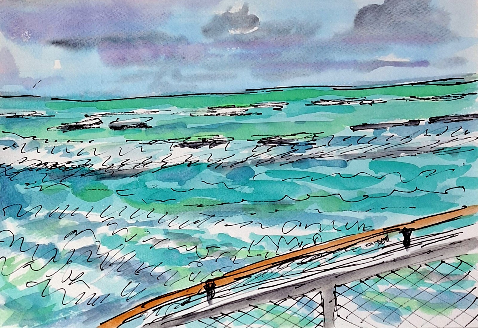 這幅街頭速寫以水彩和鋼筆速寫的方式,描繪了日本石川縣白山市的海邊景色。畫面主要呈現了廣闊的海面,海水以藍綠色為主調,用流暢的筆觸描繪出海浪的波動。海面上散落著一些淺色的物體,是海上的浪花,為畫面增添了動感。 天空以淺藍色和紫色為主,幾朵灰色的雲彩點綴其中,營造出陰天的氛圍。天空的色彩與海面相互呼應,使畫面整體色調和諧。畫面右下方描繪了一段欄杆,欄杆以橘色和灰色為主,細膩的筆觸表現出欄杆的質感和結構。欄杆的出現為畫面增添了空間感和透視感,觀者彷彿站在高處眺望海景。 畫作採用了隨性而流暢的筆觸,展現了街頭速寫的即興和自由。水彩的運用使畫面色彩豐富而富有變化,營造出輕盈而通透的視覺效果。鋼筆的勾勒則為畫面增添了線條的力度和細節。 這幅畫作捕捉了海邊陰天的寧靜和悠閒,色彩和筆觸的運用營造出一種輕鬆而愜意的氛圍。街頭速寫的風格使畫面充滿了生活氣息,彷彿帶領觀者身臨其境,感受海邊的景色和氛圍。 |