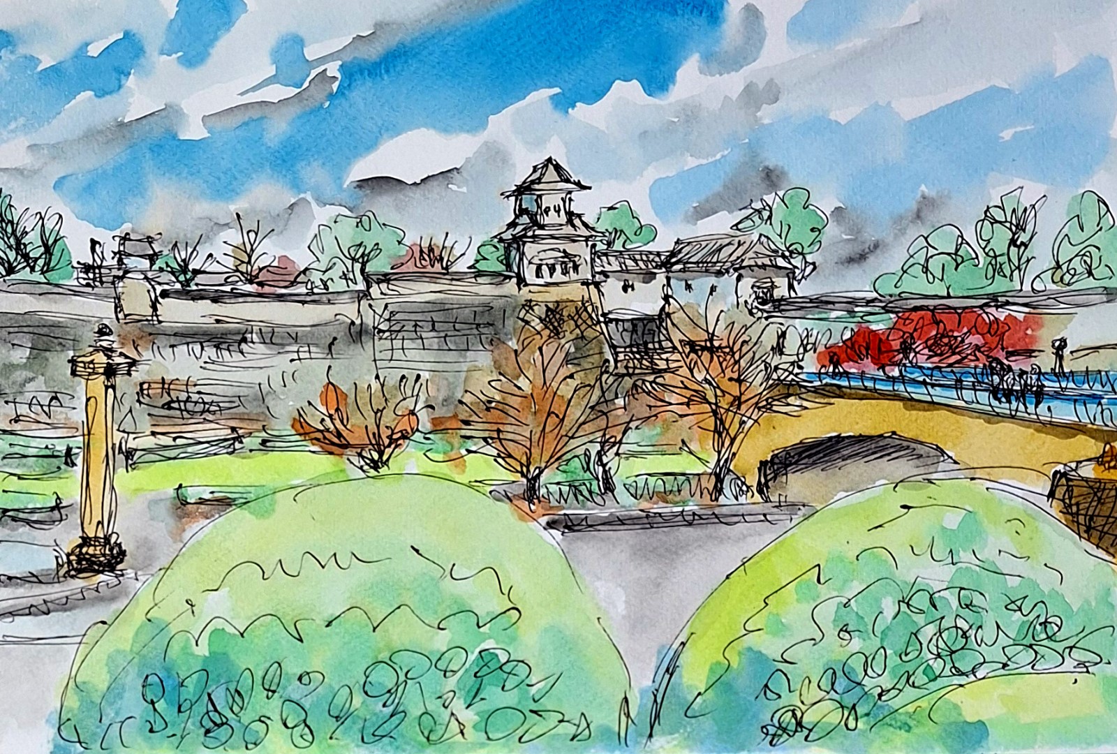 這幅街頭速寫描繪了日本石川縣金澤城公園的景色,畫面生動活潑,充滿了水彩的清新感和速寫的隨意性。畫面採用了較為寬廣的橫向構圖,將金澤城公園的景色盡收眼底。 視角是從一個略微俯視的角度,可以清晰地看到公園內的馬路、橋樑、樹木和遠處的城郭建築。前景中兩個圓潤的綠色灌木叢,作為視覺引導,將觀者的目光引向畫面中心。 水彩的運用非常出色,色彩清新明快,天空的藍色、水面的灰色、樹木的綠色和橙色,都表現得恰到好處。筆觸隨意而流暢,勾勒出建築和樹木的輪廓,既保留了速寫的快速性,又展現了水彩的暈染效果。黑色線條的運用,增強了畫面的層次感和立體感。 畫面中心突出了金澤城公園的標誌性建築——金澤城。雖然只是速寫,但建築的結構和特徵都得到了簡潔而準確的表現。水池和橋樑的描繪,增添了畫面的空間感和動感。樹木的描繪,色彩豐富,形態各異,為畫面增添了生機和活力。前景的綠色灌木叢,與遠處的建築形成對比,突出了畫面的層次感。 整體氛圍,畫面整體氛圍輕鬆愉快,充滿了街頭速寫的隨意性和生活氣息。色彩的清新明快,筆觸的流暢自然,都營造出一種輕鬆愉悅的視覺感受。 金澤城公園位於日本石川縣金澤市,是金澤城的遺址。金澤城是日本百名城之一,是加賀藩藩主前田家的居城,歷史悠久,擁有精美的建築和庭園。公園內有許多重要的文化財產,如石川門、三十間長屋等,是遊客了解日本歷史文化的重要場所。 這幅街頭速寫作品,以簡潔流暢的筆觸和清新明快的色彩,生動地描繪了金澤城公園的景色,展現了作者出色的繪畫技巧和對生活的熱愛。 |