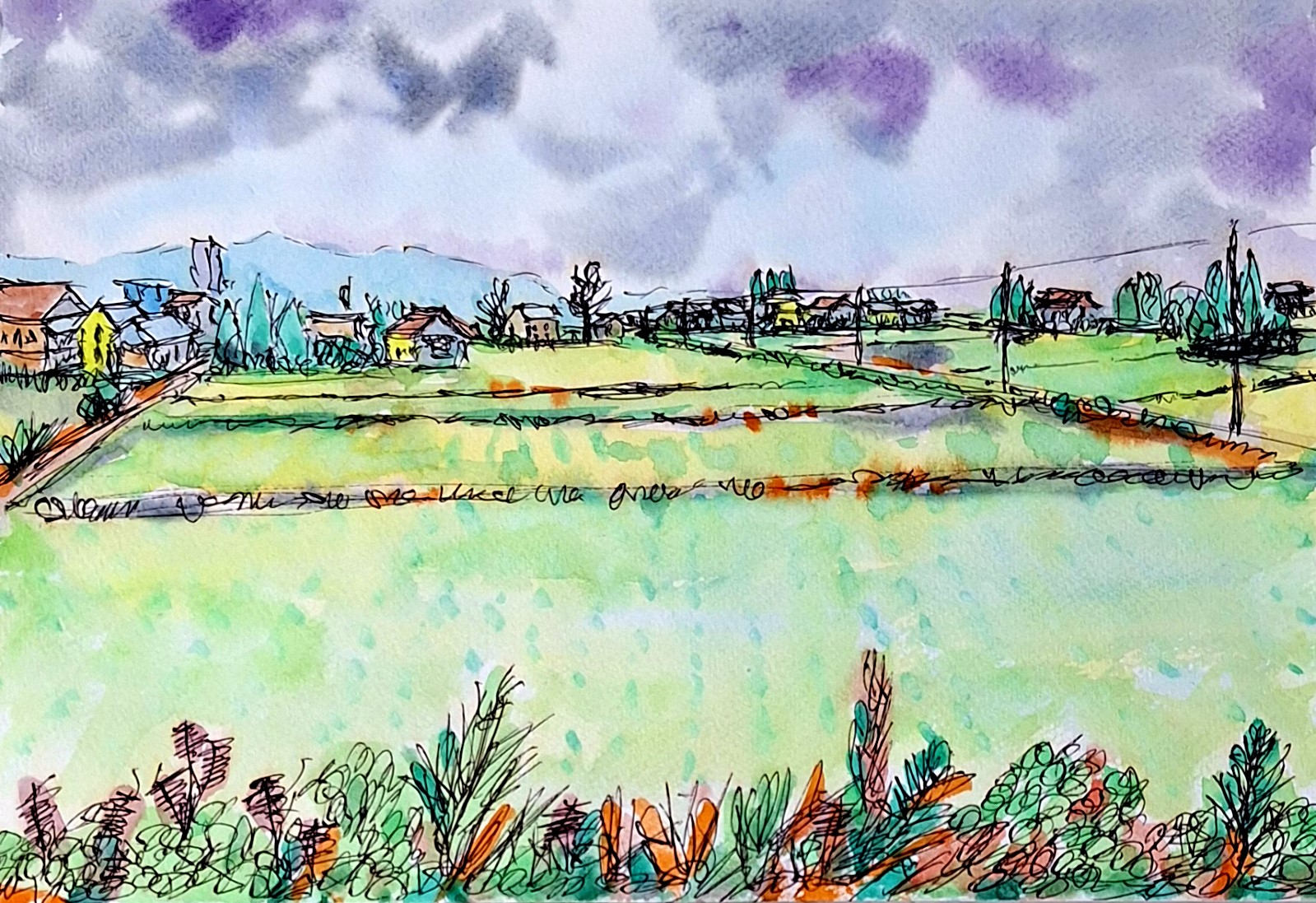這幅街頭速寫以簡潔的線條和鮮活的色彩,描繪了日本富山縣南礪市北山田的鄉村風光。畫面採用寬廣的橫向構圖,展現了開闊的田園景觀。前景、中景和遠景層次分明,使畫面具有空間感。前景的植被細節豐富,為畫面增添了生機。中景大片的田園,突顯了鄉村的特色。遠景的房屋和山脈,讓畫面有更深的意境。 畫面色彩明快,以綠色和黃色為主,表現了田園的生機。天空的紫色和灰色雲彩,為畫面增添了變化和深度。房屋的色彩各異,為畫面增添了豐富性。用色大膽,讓畫面充滿了活力。 畫家用流暢的線條勾勒出景物的輪廓,具有速寫的特點。水彩的運用使色彩過渡自然,具有水彩畫的韻味。筆觸充滿了隨意性,呈現了街頭速寫的特色。前景的植被細節豐富,包括各種顏色的花草。中景是大片的田園,田間有明顯的田埂。遠景是散落在田園中的房屋,以及遠處的山脈。電線桿貫穿了整個畫面,這是街頭速寫常見的景物。 畫面充滿了寧靜和諧的鄉村氛圍。色彩明快,筆觸流暢,使畫面具有輕鬆愉悅的感覺。這幅畫捕捉了日本鄉村的自然美景和生活氣息。 |