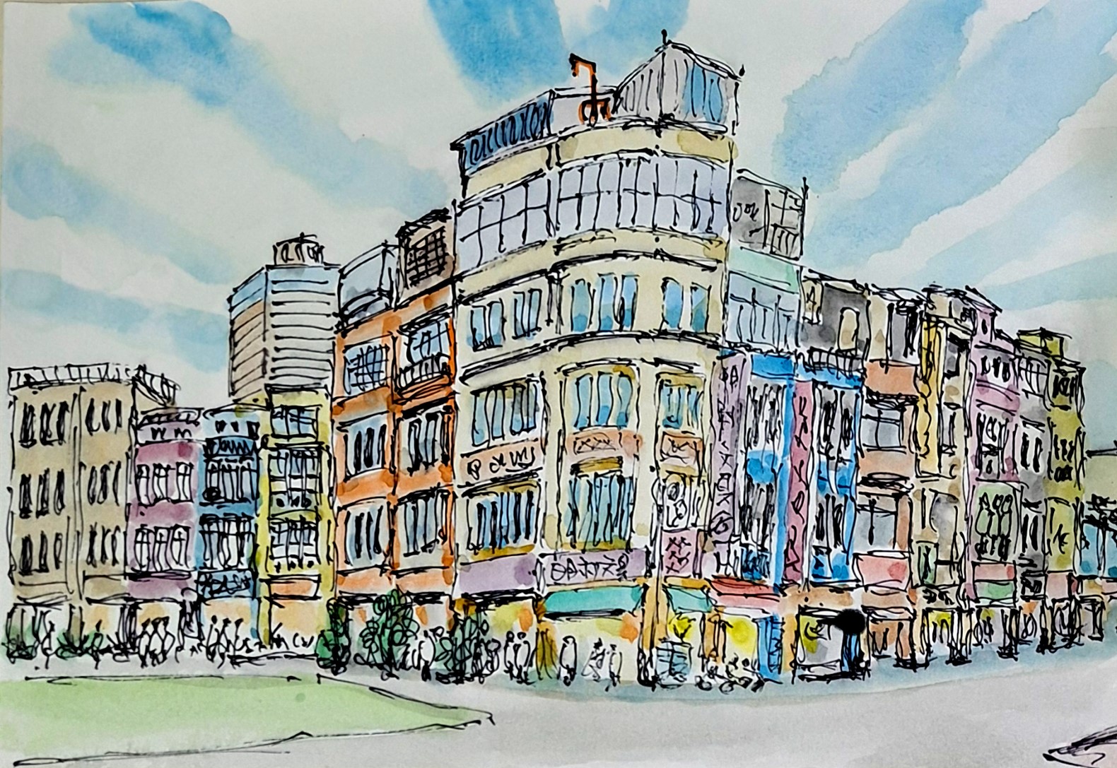 那天午後,我提著速寫本與畫筆,來到台北後車站踏園路口。這裡不是觀光客熟知的地點,卻是我最愛捕捉城市節奏的地方之一。建築密集卻不壓迫,商家招牌多彩卻不雜亂,人們來來往往,每個角落都充滿故事。 我坐在騎樓下,點了杯微甜的紅茶,展開速寫本,讓筆尖開始在紙上跳舞。畫面中央那棟弧形轉角大樓,是我第一眼就想捕捉的焦點。它的玻璃窗映著藍天,樓頂還有一座像是小陽台的空間,或許有人曾在那裡吹風、思考,或只是靜靜地看著街道發呆。 我喜歡這些大樓的線條不完美,甚至有些斜歪,那是歲月的痕跡。牆面斑駁的紅磚與新貼的彩色招牌並列,透露出老城區的堅持與新潮的混融。我用淡彩輕刷建築外牆,每一筆都是對這座城市的致敬。 畫到一半,一位老先生走過來看我畫,他笑著說:「這條街我年輕時就在跑,沒想到你把它畫得這麼活。」那一刻,我感受到創作與生活的連結,不只是畫紙上的筆觸,更是回憶與現實的交會。 畫完時,夕陽正好從街道的另一頭照射過來,金光灑在玻璃上,也落在我畫中的屋頂。這一刻,我知道,我不只是畫下了一幅街景,而是畫下了我心中,那份對台北的深情與牽掛。 |