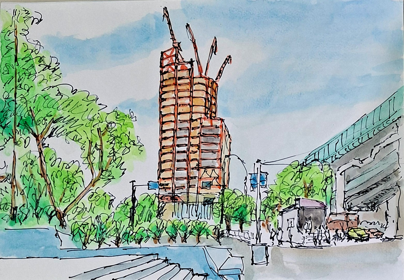 我站在台北車站外廣場,迎著車潮與人流,抬頭望向雙子星大樓的建築工地。這是個仍在建造中的巨型構想,鋼骨外露、塔吊高懸,在這片熟悉的城市肌理中劃出一道嶄新的輪廓。對多數人而言,它可能只是一個未完的工程;但對我這個習慣用畫筆記錄城市呼吸的人來說,這是一座城市夢想正在成形的見證。 我坐在行人通道旁,翻開速寫本。四周的喧囂和廣播聲交織在一起,工地傳來的機械聲宛如背景音樂。我先用鋼筆勾勒出雙子星大樓那拔地而起的骨架,線條略顯粗獷,就像它本身還在摸索成形的過程。一旁熟悉的台北車站,則穩穩地立在原地,像位見證新舊交替的守門人。 這幅速寫與我過往畫的不同,過去我捕捉的是完成的街景,是色彩繽紛的人情味。但這一次,我畫的是未來,是想像,是一個城市如何朝著下一階段邁進的片段。我不急著上色,只用一點點藍天與混濁灰塵交疊的筆觸,襯托出它仍在醞釀的姿態。 畫完時,我收起速寫本,工地仍喧鬧,塔吊仍旋轉。我不知道它什麼時候會完工,也不確定未來它會不會如計畫中那樣壯觀。但我很高興,自己曾在它尚未完美之前,用一枝筆、一張紙,記下了它成為夢想前的模樣。這,就是街頭速寫最美的地方。 |