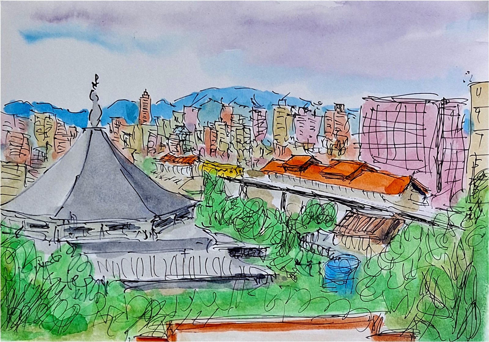 走出圓山捷運站,天色正暗未暗,斜陽透過夏末的淡金色雲層,整個城市彷彿被輕輕罩上一層舊底片的色調。往南遠眺,一排排屋瓦擠在一起,像一幅紋理細密的拼貼畫,而在這片錯落的屋頂之上,新光大樓的輪廓沉穩矗立,顯得既突兀又理所當然。 昨日世界就在眼前。這片園區保留了舊時代的陳跡與記憶,紅磚矮房、褪色的廣告牌、還有圍繞著的步道,每一處都像在訴說著城市變遷的故事。幾個背著相機的遊客駐足拍照,他們的身影被夕陽拉長,映在牆上,跟泛黃的宣傳畫交織成一幅靜止的剪影。 捷運站口人潮仍多,不同方向匆匆離去的人們,腳步裡帶著各自的心事。隔著車流,看見基隆河沿岸的綠意,彷彿是都市裡一點溫柔的喘息。轉個身,就能看見淡水河蜿蜒,遠方淡淡的觀音山輪廓,像是守護台北的一道安靜的屏障。 回望新光大樓,那座曾經是全台最高的摩天大樓,天際線在它面前輕輕下沉。白天它是地標,夜裡則變成一盞燈塔,提醒人們這座城市永不停歇的心跳。此刻,看著它與舊街屋並置,竟有種時代交錯的感傷。昨日世界,或許早已改頭換面,卻也在這片視野中,保留一絲讓人眷戀的痕跡。 在圓山捷運站的出口,等紅燈的幾十秒裡,我望著遠方那些樓房的稜線,一種複雜的情緒湧上心頭:這是屬於台北的,無法取代的溫度。 |