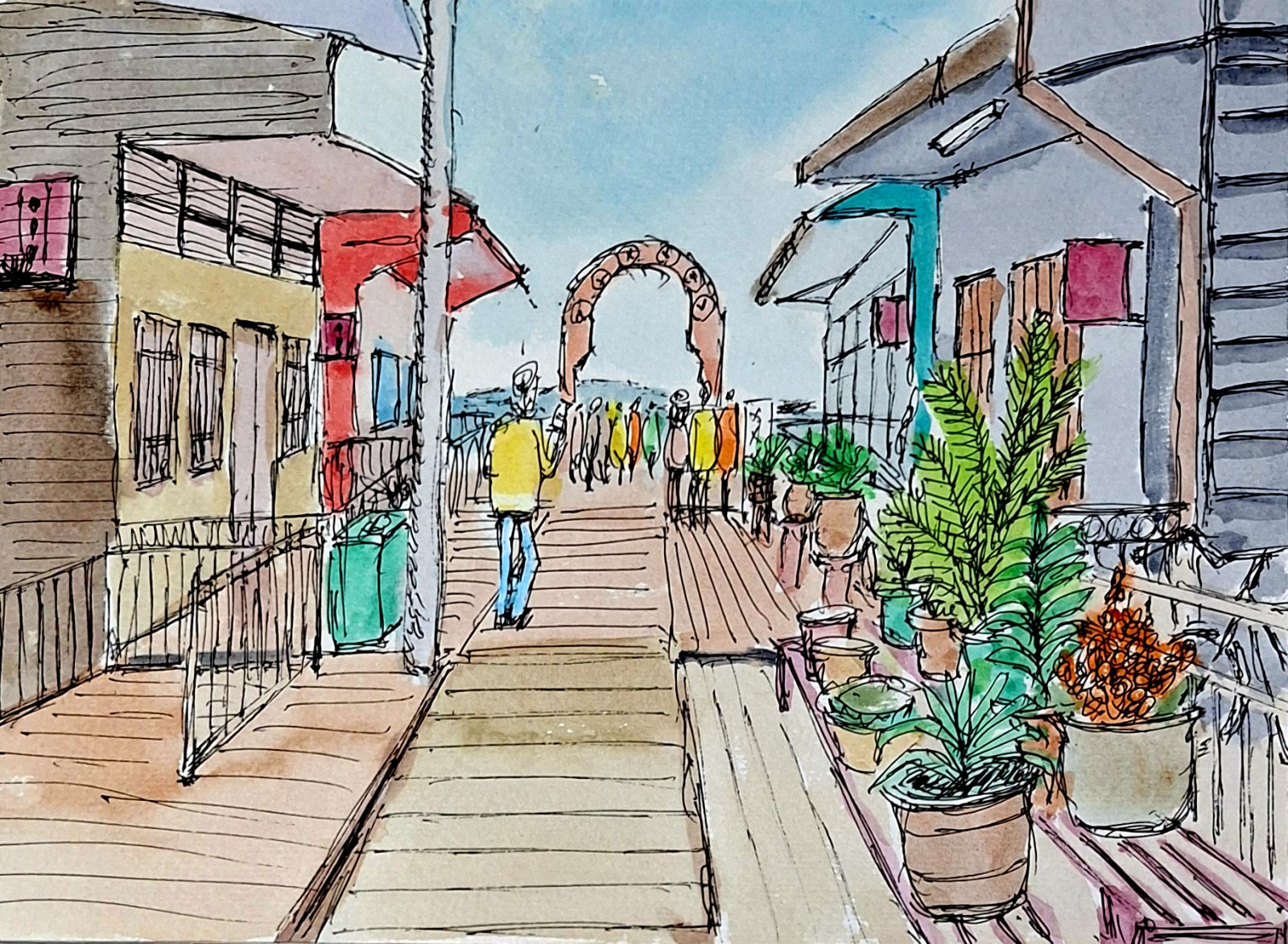 清晨的喬治敦,空氣裡還帶著一絲潮潤的涼意,沿著海岸走去,遠遠便能看見李姓橋蜿蜒伸向海面。這座百年木橋,像一條沉默的脊梁,靜靜地連接著陸地與水上人家的日常。橋身由粗壯的木樁支撐,深色的木板經年累月浸泡在海水與陽光之間,表面布滿鹽霜與裂紋,每一道紋路都像是在訴說潮汐更迭的故事。 兩側的木屋依橋而建,屋頂鋅片反射著晨光,牆面斑駁卻透著親切。屋前掛著五顏六色的衣物與晾曬的漁網,微風拂過時,布料輕輕擺動,與海面閃爍的波光呼應。屋內傳出鐵器敲擊的聲音,有人正在修理漁具;不遠處的廚房傳來煎魚的香味,混合著潮水的腥味與老木頭的氣息,構成專屬於這條橋的味道。 腳步踏在橋面上,木板發出沉穩的“咚咚”聲響,伴隨腳底的微微震動,像是在提醒行人:這裡不只是通道,更是一段歷史的延伸。遠方,高樓林立的市區輪廓清晰,與眼前的傳統水上社區形成鮮明對比。站在橋中央,既能看見現代喧囂的影子,也能感受海風中流淌的古老安寧。李姓橋,就這樣靜靜見證著世代更替與人情延續,彷彿每一片浪花,都在為它低聲吟誦著過去與現在的故事。 |