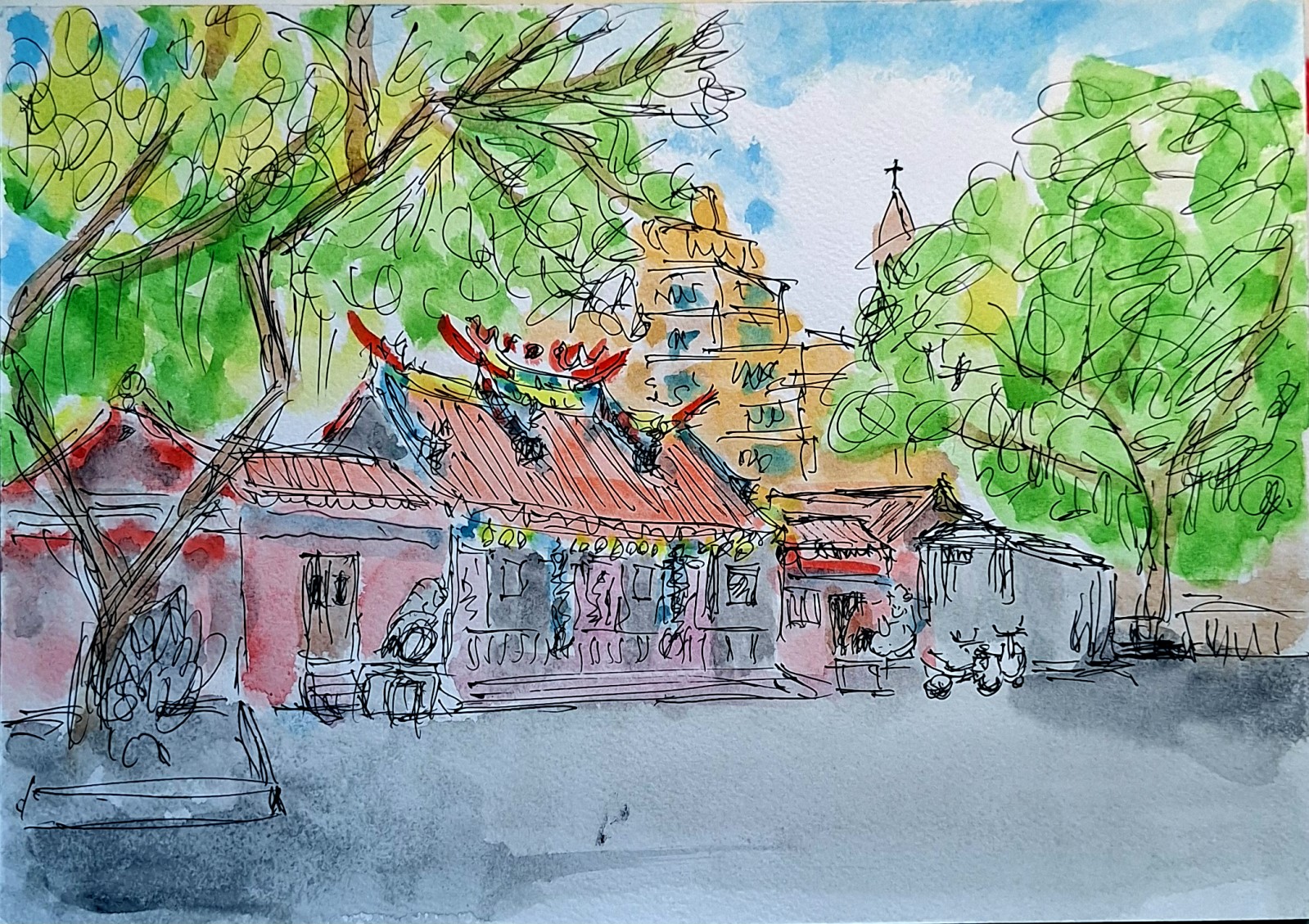 清晨的大稻埕,空氣裡混著淡淡的河風與香火味。我站在慈聖宮前,紅磚牆在晨光中顯得溫潤,像被歲月反覆摩挲過的掌心。天上聖母端坐殿中,金身不張揚,卻自有一種安定人心的力量。香客一早便來,手中的線香筆直,煙霧緩緩上升,彷彿把生活的重量交給天空。 廟埕不大,卻很熱鬧。阿嬤坐在矮凳上折金紙,手法俐落,嘴裡低聲念著祝禱;年輕人牽著腳踏車停在一旁,順手拜一拜再趕路。廟口的小吃攤正冒著熱氣,油蔥香與湯氣在空氣中交錯,與香火形成一種奇妙而親切的日常節奏。這裡沒有觀光的喧嘩,只有生活本身。 我拿起筆,線條跟著人流走。廟檐的剪黏細節繁複,卻不顯矯飾,像老城的耐心;石階被踩得發亮,每一道痕跡都是時間留下的腳步。偶有信眾在媽祖前停留得久一點,眼神專注而柔軟,那一刻,城市的速度被放慢。 遠處傳來車聲,近處是鈴鐺與木魚的節拍。天上聖母不言不動,卻像守著這片街區的呼吸。她看過潮起潮落、商旅往返,也看著今天的台北在人群裡繼續前行。我收起速寫本,墨線未必完美,但那份安穩已經留在紙上,也留在心裡。 |