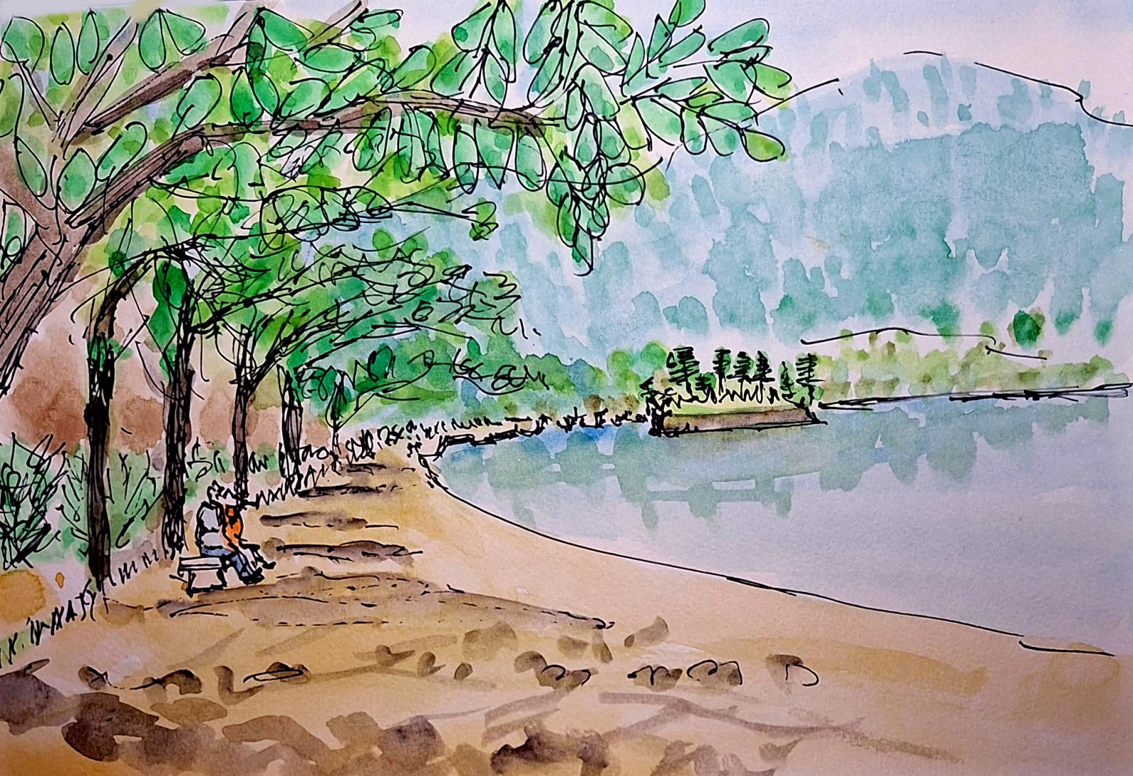 初秋的十和田湖,湖水像一面靜止的鏡子,把天空的藍與山巒的綠完整地收藏起來。微風從湖面吹來,帶著淡淡的涼意,也帶著一點山林特有的清新氣息。遠方的遊船慢慢滑行,在水面劃出細細的白線,又很快被湖水溫柔地抹平。 岸邊木棧道上,一對情侶並肩而坐。女孩穿著米色風衣,頭髮被風吹得輕輕飄動;男孩手裡拿著相機,卻遲遲沒有按下快門。他們沒有太多言語,只是靜靜看著湖面,彷彿此刻的風景不需要被框住,記憶本身就已經足夠清晰。偶爾女孩低聲說話,男孩微微點頭,兩人相視一笑,那種自然流露的默契,比任何刻意的姿勢都更動人。 湖畔的樹影斑駁地落在他們腳邊,陽光從雲縫間灑下來,為畫面添上一層柔和的金色。遠處傳來孩子的笑聲與遊客的交談聲,但在這片寬闊的湖光山色之中,一切都顯得遙遠而輕盈。時間彷彿慢了下來,只剩下呼吸與風聲。 速寫本上,我用簡單的線條勾勒出他們的背影,湖面以淡淡的水彩暈染開來。情侶的身影不必細描,只要抓住肩膀靠近的距離與微微傾斜的角度,就能表現那份親密與安定。風景是背景,而人,是畫裡最溫柔的焦點。 在十和田湖的寧靜裡,他們的愛情顯得格外真實,不張揚、不誇飾,只是在天地之間,靜靜並肩。或許多年後,他們會忘記當天說過什麼,但湖水的顏色、微風的觸感,以及彼此身旁的溫度,會成為心中最柔軟的一頁。 |