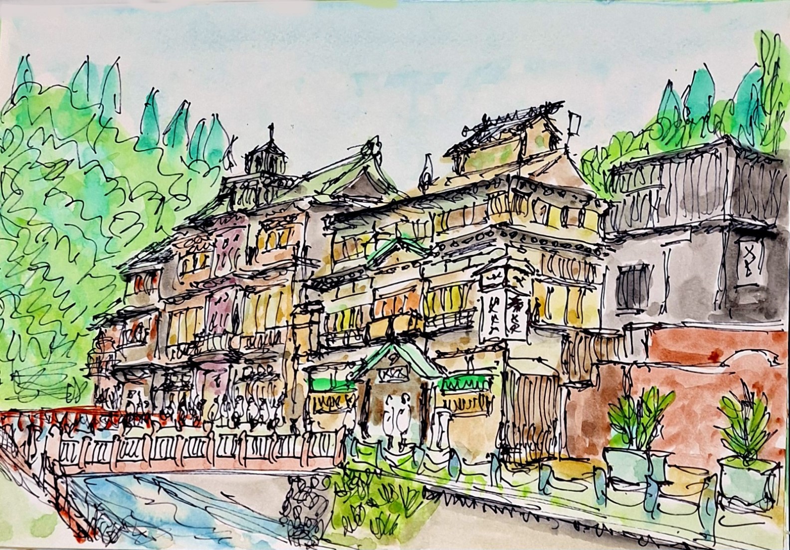 銀山溫泉位於山形縣深山之中,沿著蜿蜒的河流而建,整個小鎮像是從古老時光中走出來的畫面。木造旅館層層疊疊,屋頂覆著暗紅色或深棕色的瓦片,窗戶透著昏黃的燈光,傍晚時分整條街道被柔和的光暈包圍,帶著一種靜謐而溫暖的氣息。 街道兩旁鋪著石板路,走起來發出輕微的回聲,河邊的欄杆上掛著小小的燈籠,微風吹過,燈光輕輕晃動。旅館門前的木質看板和吊掛的布簾,隱約散發出傳統日式風格的韻味,令人忍不住放慢腳步。偶爾有遊客輕聲交談或踏水而過,聲音不大,卻讓整個溫泉街更顯生活氣息。 站在橋上望去,河水映著兩岸旅館的倒影,煙霧從溫泉湯屋中升起,像是為小鎮覆上了一層夢幻的薄紗。速寫筆下,木窗、瓦屋與燈光交錯成獨特的韻律,每一筆都想捕捉那份恬靜與懷舊感,彷彿時間在這裡緩緩流動,不忍打擾。 |