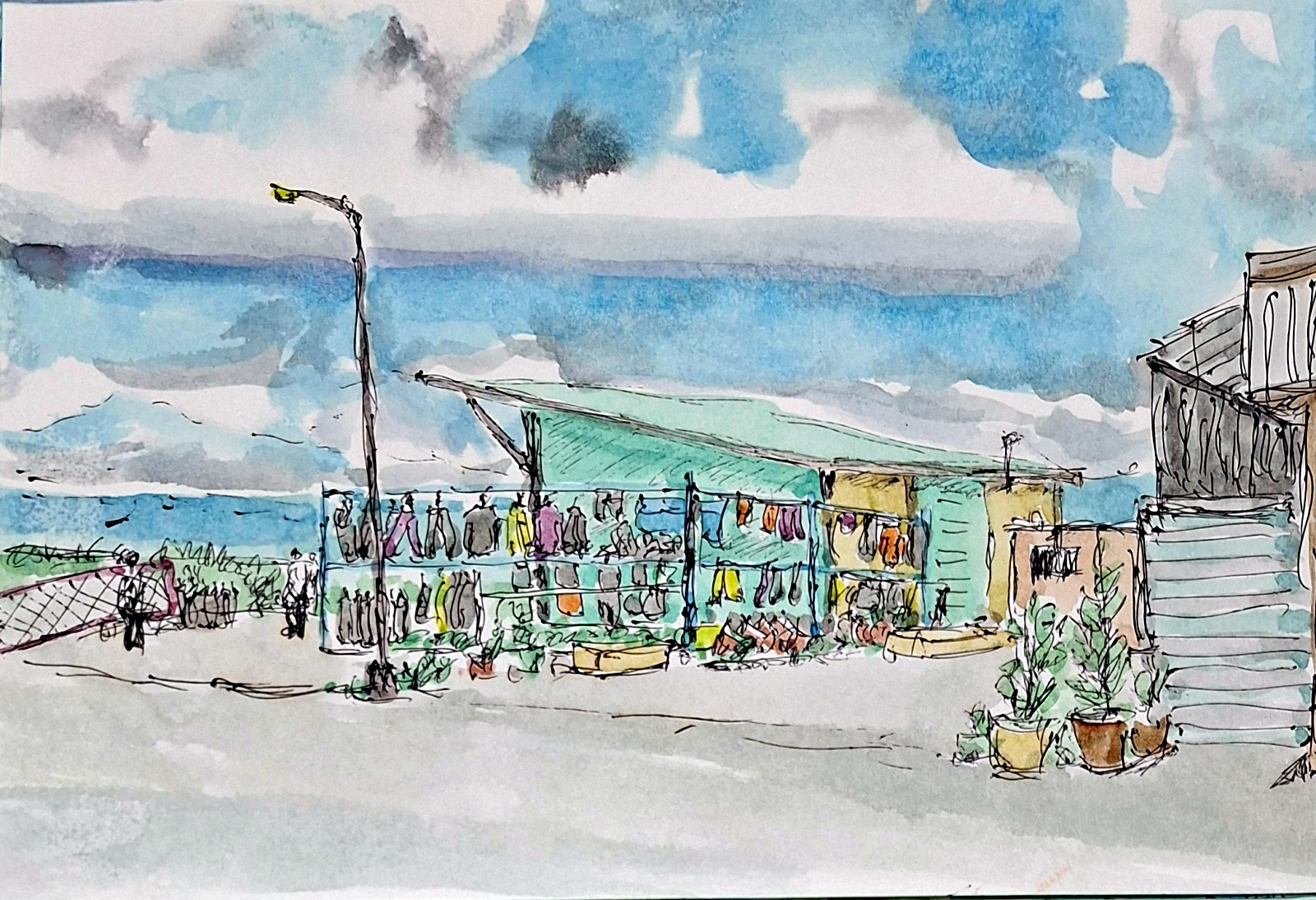 午後的陽光落在綠島街道上,空氣裡帶著濃濃的海鹽味。我停在一間潛水店門口,沒有招牌的張揚,卻堆滿了色彩鮮明的裝備——蛙鞋、面鏡、氧氣瓶整齊又隨性地排列著,像一種即將出發的預告。 我找了個角落坐下,打開速寫本。店門半開,裡面傳來教練的講解聲與笑聲,幾個準備下水的旅人正試著調整裝備,動作有些生疏卻充滿期待。牆上貼著泛黃的潛點地圖與照片,每一張都像是另一個世界的入口。 我試著畫出那些堆疊的器材線條,但很快就被節奏打亂。有人踩著拖鞋匆匆走過,有人剛從海邊回來,頭髮還滴著水,整間店像是流動的,不斷有人進出、準備、出發。這裡不是靜止的場景,而是一個過渡的地方——從陸地走向海底。 畫到一半,我停下筆,看著門外那條通往海的方向。風輕輕吹進店裡,帶動掛著的裝備微微晃動,發出細小聲響。也許真正吸引人的,不只是潛水本身,而是這種即將踏入未知的感覺。 我收起速寫本,心裡忽然明白,這間小小的潛水店,其實裝著的,是每個人對海的想像與一點點勇氣。 |
