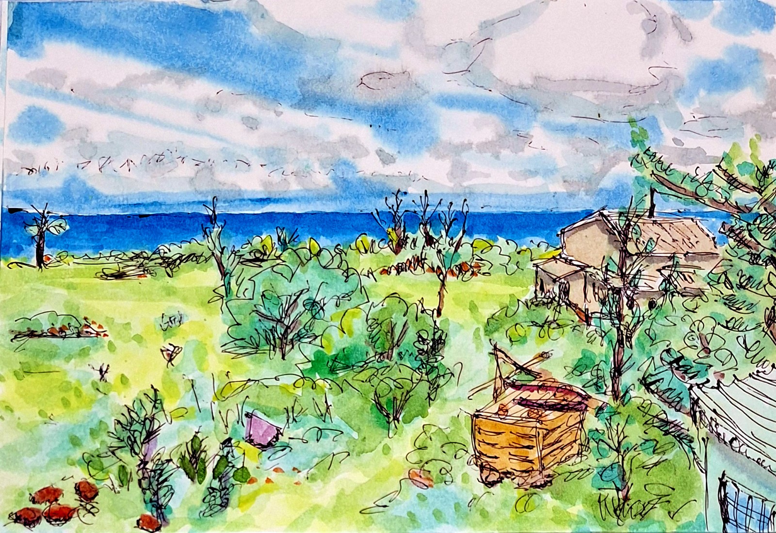 清晨的綠島,空氣裡還帶著一點海水的鹹味與夜裡殘留的涼意。我坐在早餐店的露天二樓,木質的桌椅被海風吹得微微泛白,邊角有些歲月磨損的痕跡。陽光從對面低矮的屋頂後慢慢爬升,斜斜地灑進來,把整個空間染成一種溫暖的金黃色。 樓下傳來煎台滋滋作響的聲音,老闆熟練地翻著蛋餅,偶爾抬頭和熟客寒暄幾句。空氣中飄著奶油與醬油混合的香氣,還夾雜著剛烤好的吐司味,讓人不自覺地餓了起來。我面前的早餐簡單,一份蛋餅、一杯冰紅茶,卻在這樣的早晨顯得格外豐盛。 遠方可以看見海,一片藍得很乾淨的顏色,幾艘小船靜靜地停在岸邊,彷彿還沒完全甦醒。偶爾有機車從街道上經過,聲音不大,卻清楚地劃過這份寧靜。幾位旅人也坐在另一側,有人低頭滑手機,有人只是發呆看海,彼此之間沒有交談,卻共享著同一段悠閒的時光。 我拿起筆,在速寫本上輕輕描繪這一刻。不是為了畫得多精細,而是想記住這種緩慢的節奏——沒有催促、沒有壓力,只有風、陽光與早餐的香氣。綠島的早晨,就這樣靜靜地展開,像一幅還沒完成的畫,而我只是剛好坐在畫裡的人。 |