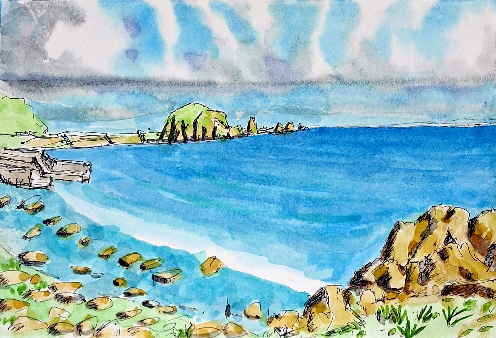 站在綠島公館鼻的高處,風迎面而來,帶著鹹鹹的海味,也帶著一種遼闊的自由。我把速寫本攤開,試著用最簡單的線條捕捉眼前的景色。遠方的海平線筆直而清晰,像是一條安靜卻無法跨越的界線,將天空與海洋輕輕分開。 海水的顏色層層變化,由近而遠,從透明的淺藍、碧綠,一路過渡到深沉的藍黑。浪花拍打著岩岸,節奏規律又帶點隨性,就像自然的呼吸。幾塊突出的礁石靜靜佇立,在畫面中形成穩定的重心,也讓整體構圖更有力量。 我用鉛筆快速勾勒輪廓,線條不求精細,只求感覺。風不斷翻動紙張,讓我不得不用手壓著,這樣的狼狽卻讓人覺得真實。偶爾抬頭望向遠方,那片無邊的海讓人暫時忘記時間的存在。 在這裡速寫,不只是畫風景,更像是在記錄一種當下的心境。沒有城市的喧囂,只有海聲與風聲相伴。當最後一筆落下,我知道這張畫或許不完美,但它完整保留了我站在公館鼻遠眺時,那一刻的寧靜與遼闊。 |