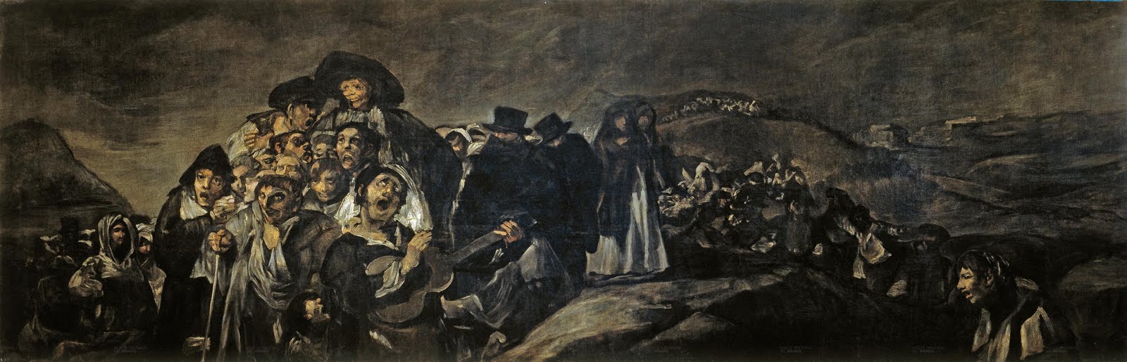 ![]() Francisco Goya: 《聖家族》"The Holy Family" 1774, oil on canvas, Museo del Prado, Madrid. 1782皇家委託聖方濟教堂巨型祭壇飾畫《西恩納的聖伯那汀》耗時兩年,試圖營造空間與深度上的生動感覺。 ![]() 《受傷的鋪磚人》1786,為Osuna公爵製作的織錦草圖,社會寫實畫的先驅,用色與題材都揮灑自如 ![]() ★《布偶遊戲》1791-92,耶斯克里亞宮殿的織錦掛毯草圖 ![]() ★★ 十九世紀的藝術先聲《聖依色朵的草原》,1788 ★★ 5月15日Mnazanares 河畔慶祝馬德里首護女神 Sanit Isidore 日 Saura 在電影中將這幅油畫作了絕佳的利用與呈現 ![]() ★《Maris Luisa 》1786 查理四世老婆,據說毒死阿爾巴公爵夫人 ![]() 《狩獵的查理三世》1787 ![]() ★《歐蘇納公爵家族》1788 3. 1793-1803 功成名就、理性漸起(1789查理四世登基、任命哥雅為御用畫家、1792失聰) ![]() ★《穿黑衣的阿爾巴公爵夫人》1797★ ![]() 《查理四世家族》1800 ![]() ★《幻想曲》之《理性入夢引來群魔》1797 Masks of B. There are Also Asses Who Put on the Mask of the Literati ( 罵Godoy攀附皇家血緣-- 上溯至他的祖父!) ![]() ![]() Fresco de la cupula de la Ermita de San Antonio de la Florida por Francisco de Goya ★馬德里「聖安東尼奧‧佛羅里達教堂」Ermita de San Antonio de la Florida 壁畫《帕多瓦聖人安東尼的奇蹟》,是當時歐洲藝術界的新氣象1798 4. 1804-1818 接觸鄉里、 見證歷史 (耳聾的困頓、1789 法國大革命,都使他更想貼近鄉土人民,另一方面他又作畫諷刺當時社會現象;1808春,拿破崙揮軍馬德里干涉西班牙王室,人民游擊隊開始持續抵抗,慘禍不斷;1813 與Leocadia 同居,1815因兩幅《瑪哈》遭到宗教法庭審判 ) ![]() 《抱水罐的女孩》1808-12 ★The Disasters of War《戰爭的慘禍》銅版系列82 幅 1808-23 ★ ![]() 《戰爭的慘禍》版畫在Goya in Bordeaux影片中的鬼魅萬人塚景象 ![]() ★★《剖開的公羊》1812 ![]() ★《1808年5月3日》法軍處決西班牙叛軍 1814 5. 1819-1823 控訴黑暗、追逐自由 (在馬德里購置「寧靜山莊」,開始《黑色壁畫》系列。1824,78歲,自我流放法國波爾多。) ![]() ★黑色壁畫之《聖依色朵的朝聖者》1820-23★ ★《撒旦噬子》1820 象徵主義先聲 ![]() ★《 自畫像》1820 ![]() ★《波爾多賣牛奶女孩》1827 ^^^^^^^^^^^^^^^^^^^^^^^^^^^^^^^^^^^^^^^^^^^ 印象派先聲 畢生的摯愛與關注 -- 鬥牛,『我的西班牙』!!! ![]() ★《鬥牛》1824 ![]() ★《鬥牛》The Bullfight, circa 1825 |