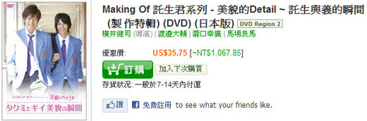 剛打的字完全消失... 重打忘了要說啥... 只是DVD今天剛收到,不嫌羊貴的可以和我一樣收實體 是說,大輔真的很介意年紀吔.... 我是先訂了電影看完後決定逐步把製作專輯收編... 我很像很習慣買製作專輯的樣子,因為電影只要單出製作專輯我都會收,像壽司王子,妹妹戀人,FLY DADY FLY...太多了...只要敢出我就會想盡辦法敗吧...呵呵呵... 昨天先看別部BL,其實BL怎麼幾乎都是悲劇收尾呢...分析原因大部都是外力介入,不管你是後來介入者還是被橫刀奪愛者,最後,很多都會被暴力所害...其實BL和普愛一樣,感情一旦發生是沒有所謂性別,年紀的...要專心,知自己是抱著什麼態度去對待感情的,相信都會有美麗的HAPPY END..