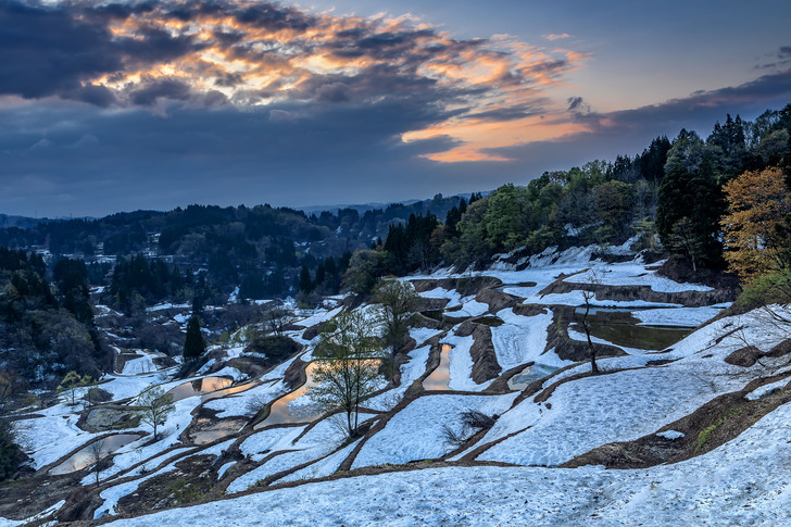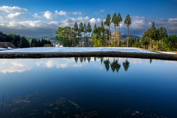 今天一早天剛亮直接出發去蒲生梯田拍日出(車程1分鐘),雖然天空有點雲層但是橘紅色的天空映在田中還是很美,只是光線跑很快動作要快否則才設定好光線又跑掉了,拍了一會水某發現陽光從雲縫中撒下形成光束,抓緊機會趕快拍攝擔心一下子就沒了,天空中又發現雲層被陽光照到真是感嘆大自然的奧妙,正要結束蒲生梯田的拍攝看到一日本攝友跑到另一地方,我也跟著去看看是否有東西可以拍,看到樹倒映在田中很美趕快叫水某來拍,拍完離早餐還有點時間前往儀明梯田(車程3分鐘)補拍,今天的早餐很精簡,飯後與民宿老闆夫婦合照留念,結束在十日町的旅程前往下一個景點松ヶ峯。