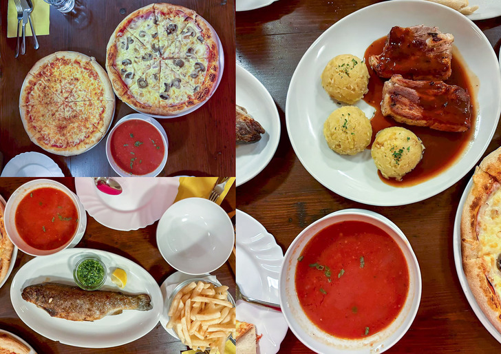 拍攝後趁天黑前前往民宿旁的餐廳用餐,沒想到因為星期天餐廳已經打烊了,還好剛剛在觀景台拍照時發現旁邊有一家餐廳有開,車程10分鐘,晚餐點了披薩、薯條、烤肉、鱒魚跟湯,鱒魚烤肉都好吃,但是披薩跟湯好鹹喔,害我們之後好幾餐都不敢再點披薩了。吃飽飯後回到民宿確認好明天行程就讓旅途勞累的大家早早休息。