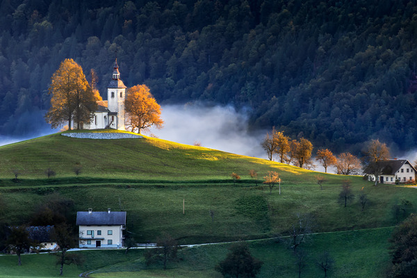 拍的差不多時直接往教堂所在地近距離拍攝(8分鐘車程),抵達時看到牛群也遇到附近學校的一群小朋友(應該是戶外教學),想想這裡的小孩真幸福啊,學校就建在這美麗的山上。走到了教堂下面發現還是遠眺比較美! 拍完我們就下山回民宿,今天要移動去下一個住宿點此行的另一個重點--布萊德湖,回民宿途中經過另一烘焙坊買了麵包當早午餐。