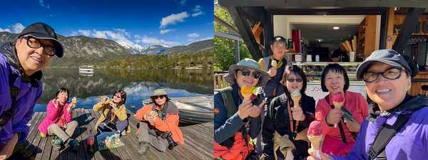 抵達施洗者聖約翰教堂路邊停好車,接著又是要付停車費,操作了半天還是不給過,只好再度找人協助,在別人幫忙下順利繳費印出停車單據,原來我們剛剛操作只差在感應信用卡時不能把卡一直放在上面,只需過一下就可以了,唉~ 不經一事不長一智! 搞定停車費後往湖邊走去,先在碼頭上解決午餐(早餐吃剩下的麵包),各自散開邊走邊拍,湖水清澈乾淨、倒影清晰,搭配教堂或遠處的雪山甚是美麗。要離開前阿香的每日一支冰淇淋要享用起來,吃完下一站-布萊德湖民宿(27分鐘車程)。