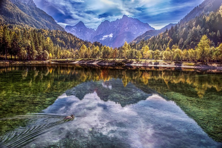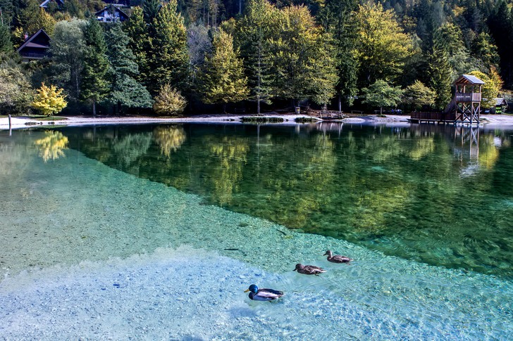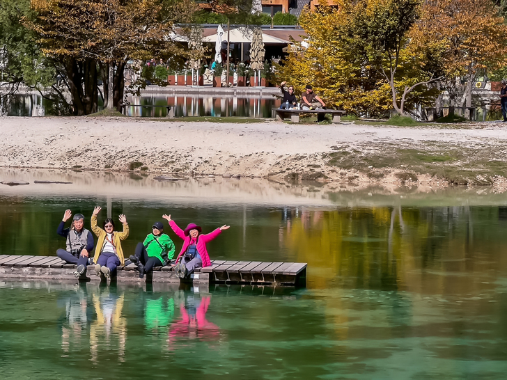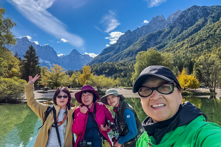 抵達特里格拉夫國家公園停車場,這回停車跟在台灣一樣進去先拿停車卡出去在去繳費機台繳費(比較簡單),我們抵達的是阿爾卑斯山腳下的亞斯納湖是座冰蝕湖,湖水呈藍綠色,天氣好時可清楚看見遠處山峰的倒影壯闊而美麗。有點可惜的是山上沒積雪,樹葉也不夠紅,但是湖水清澈見底,山峰與植物的倒影清晰可見,我們停留了大約兩小時才離開。