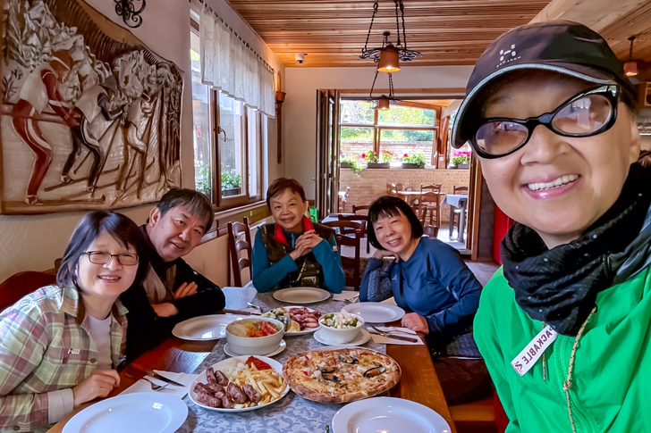 快到特里格拉夫國家公園途中差不多是午餐時間,水某在Google Map上找到一餐廳有爐烤披薩,不是說不敢再點披薩了嗎? 但這裡的披薩是現烤的,也不會很鹹,好吃耶! 午餐後在餐廳旁看到有人趕著羊群就跟著去看看,草地上有兩隻小羊跟著母羊喝奶,牧羊的年輕人看到一群外國人對著他的羊猛拍,也笑著跟我們點頭致意。